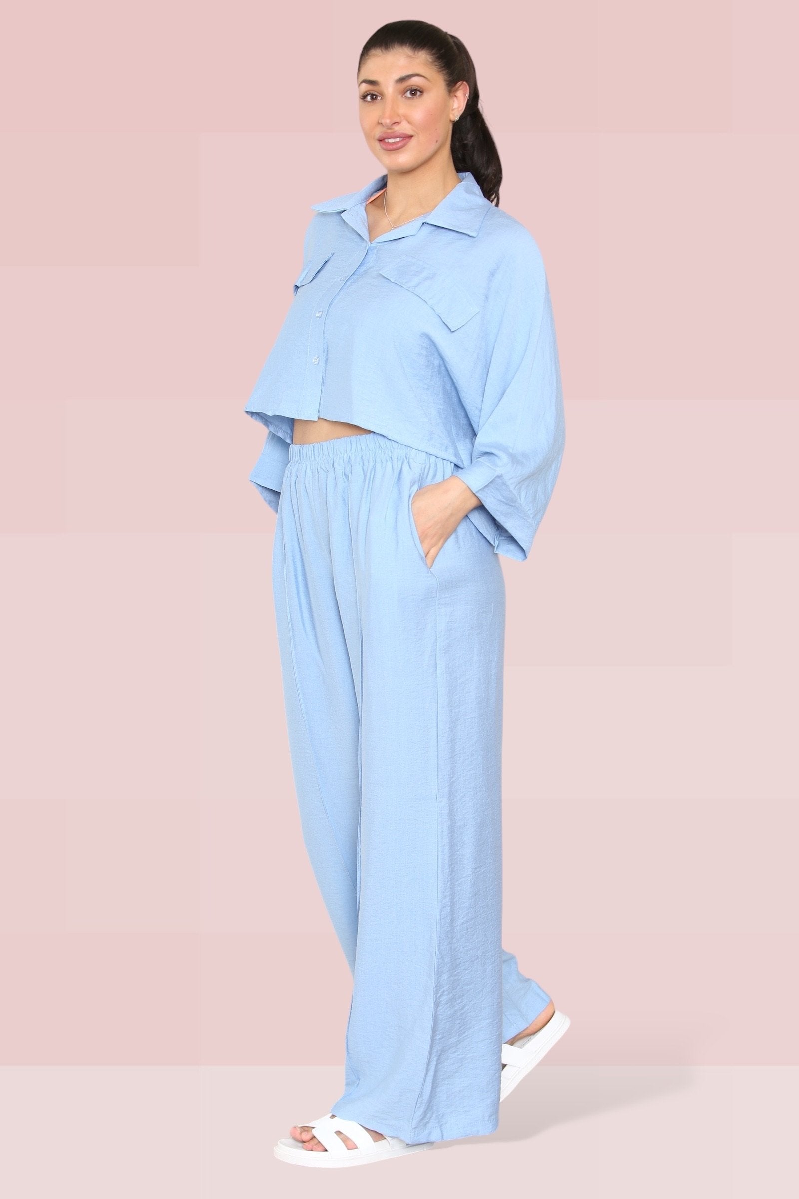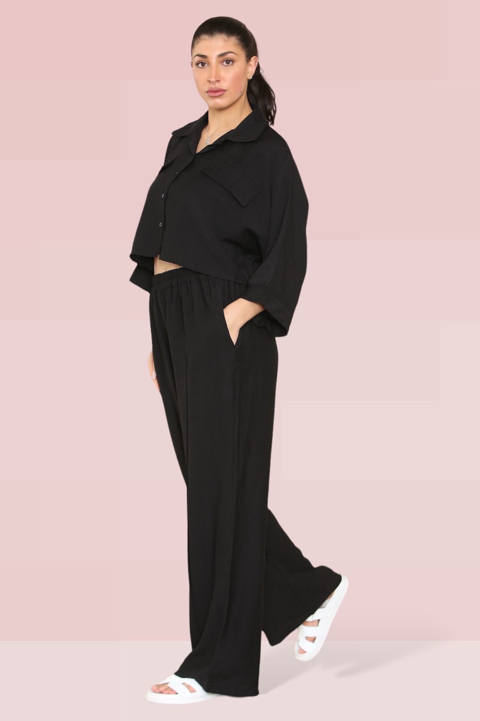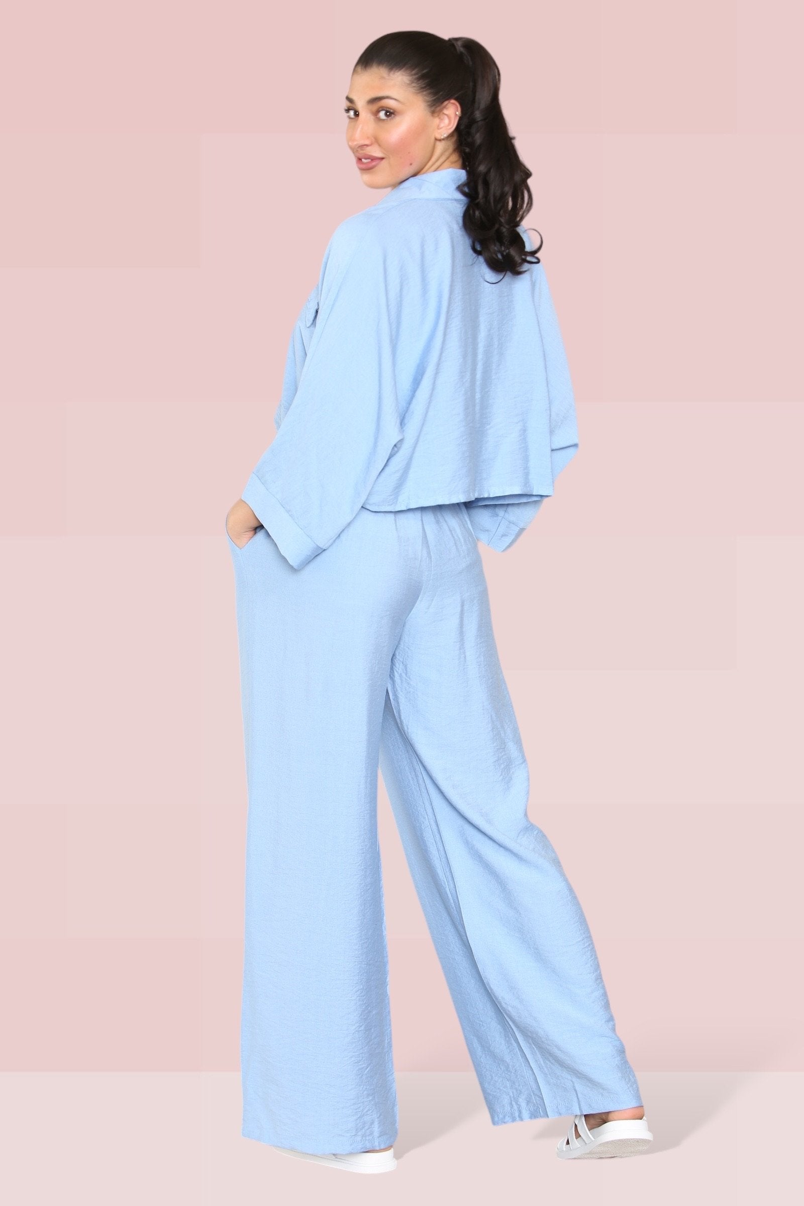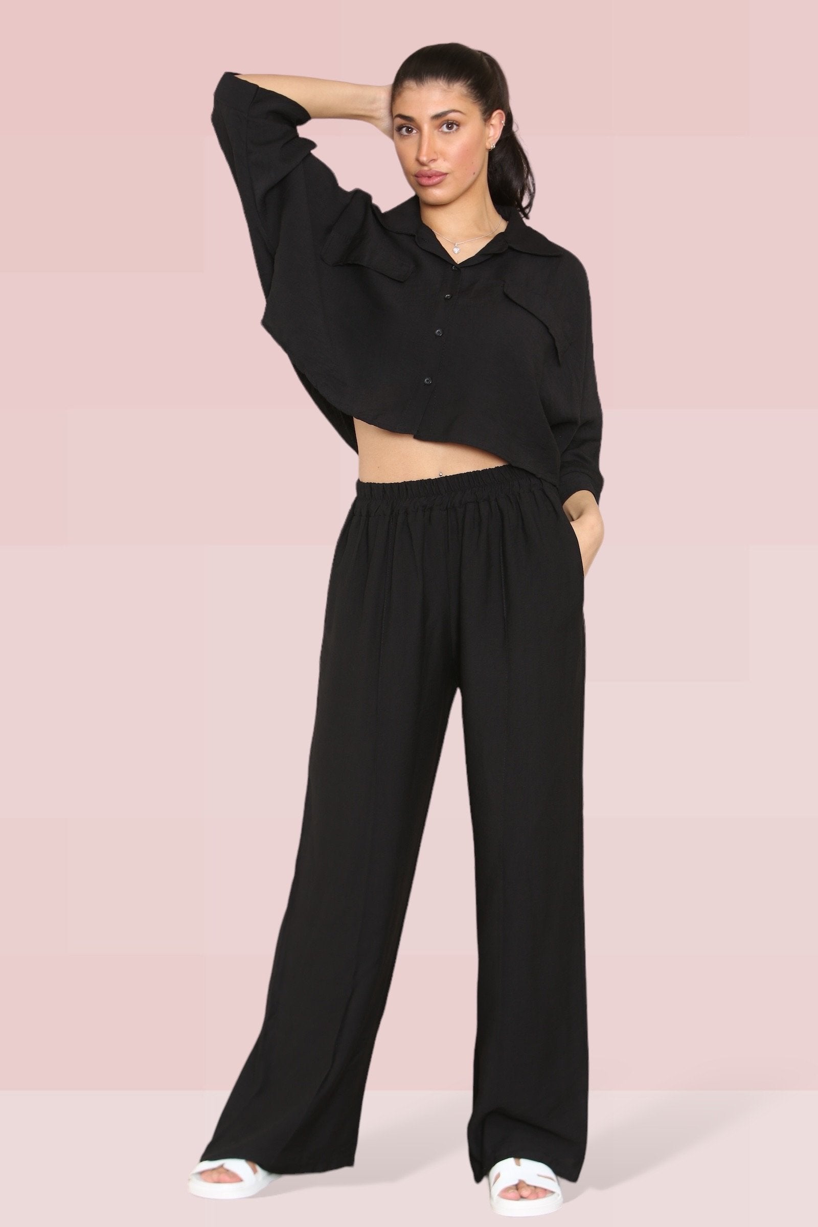 The cropped length offers a playful twist, perfectly complemented by an elastic waist that ensures both comfort and style. The lightweight fabric drapes beautifully, enhancing the wide-leg fit that’s ideal for any occasion.