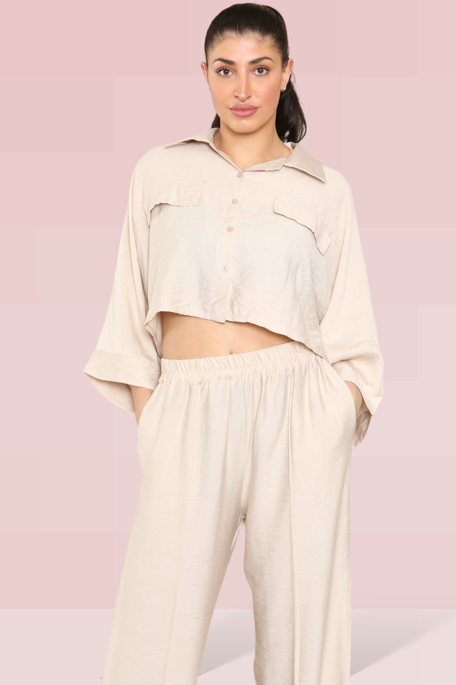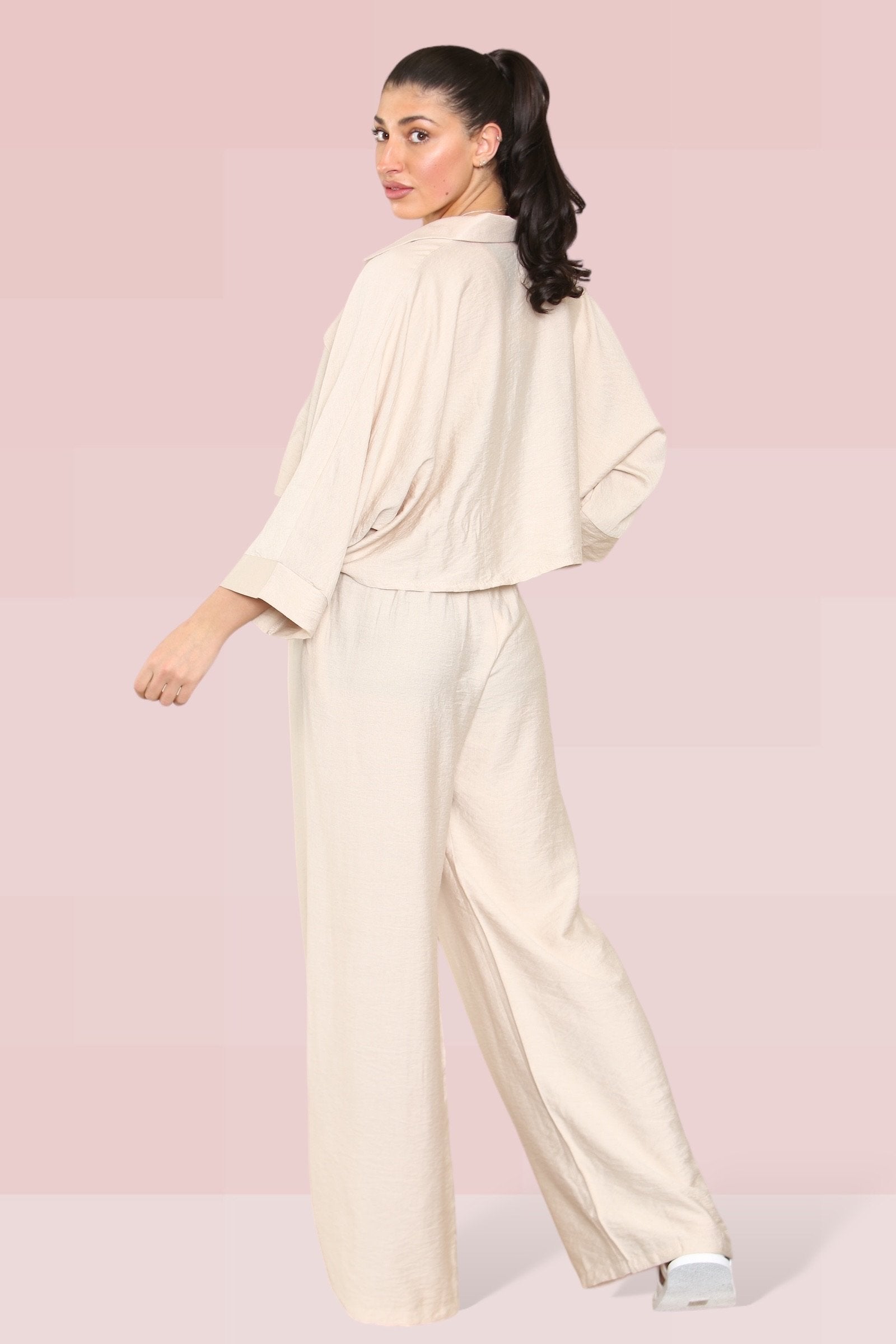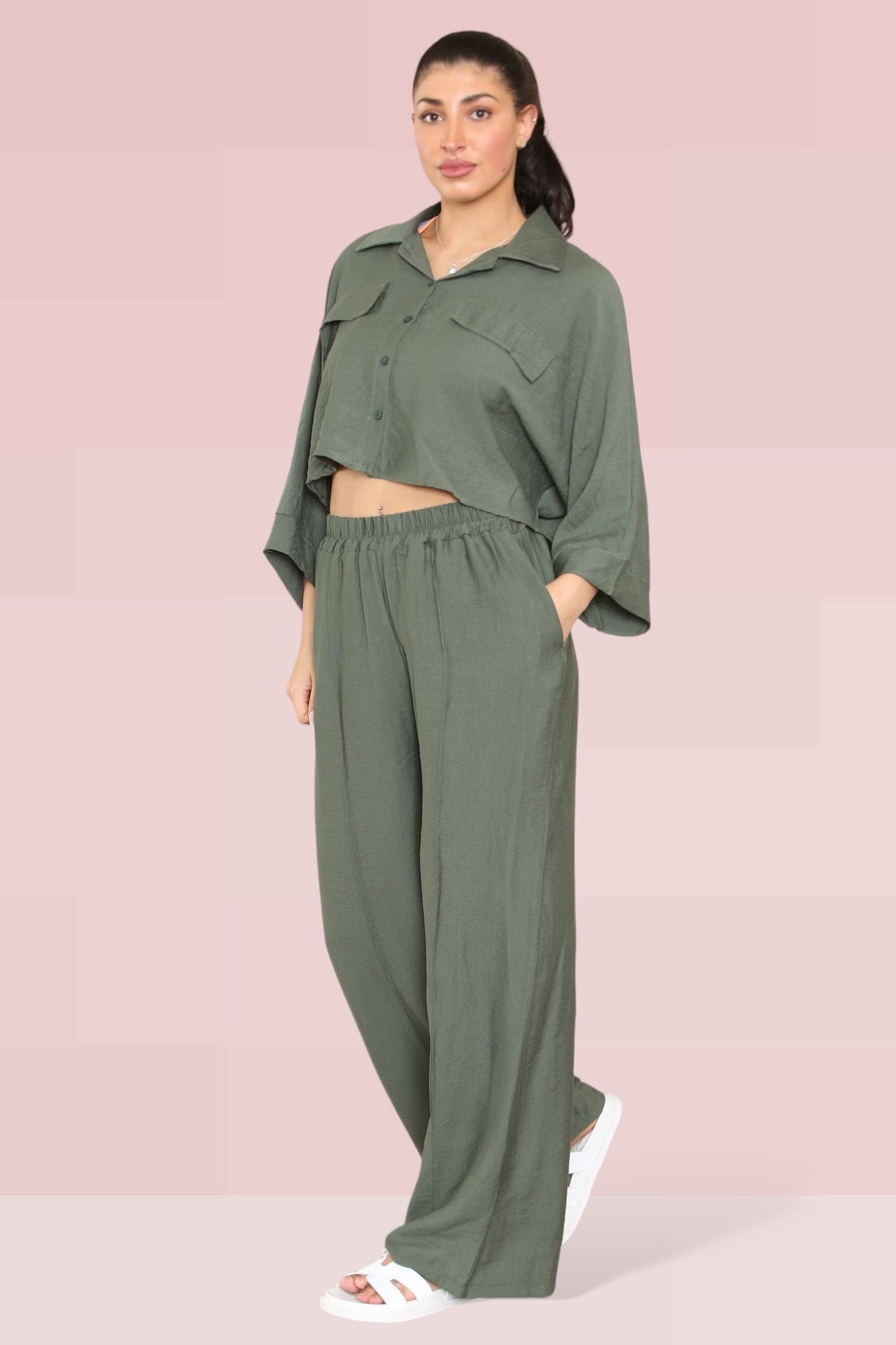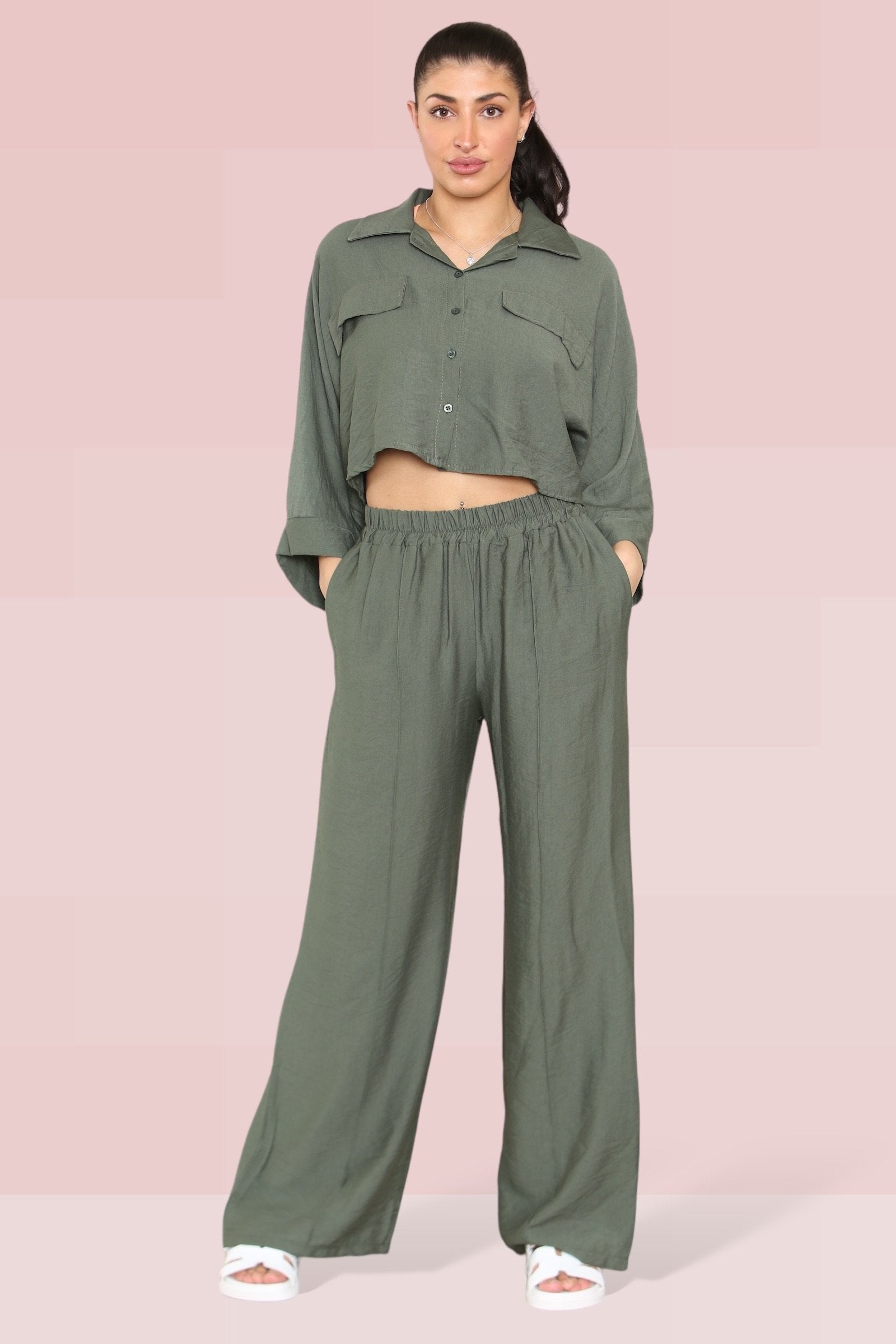 The cropped length offers a playful twist, perfectly complemented by an elastic waist that ensures both comfort and style. The lightweight fabric drapes beautifully, enhancing the wide-leg fit that’s ideal for any occasion.