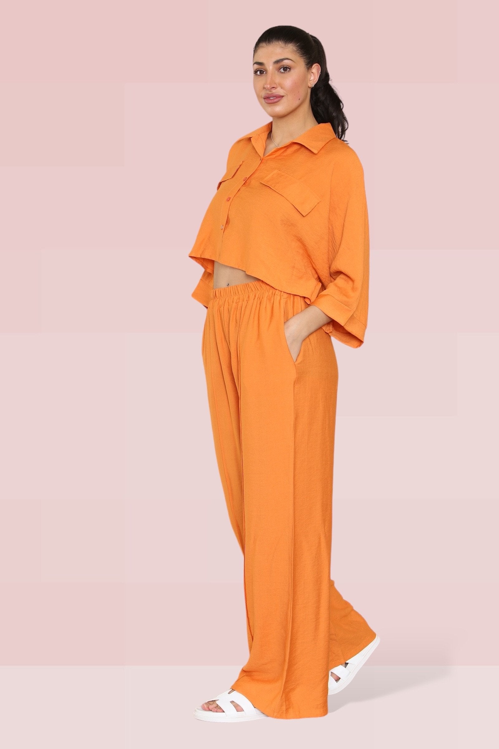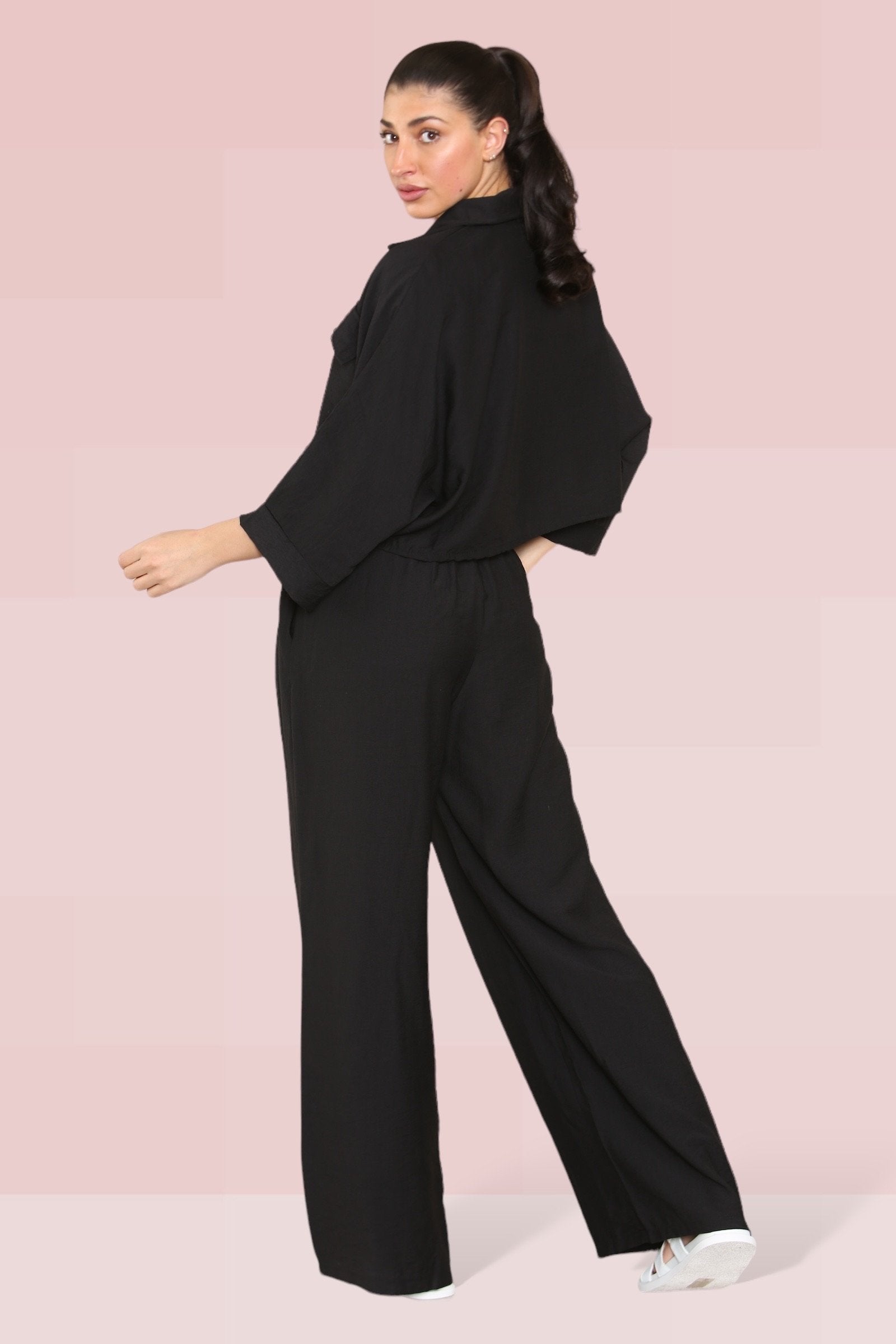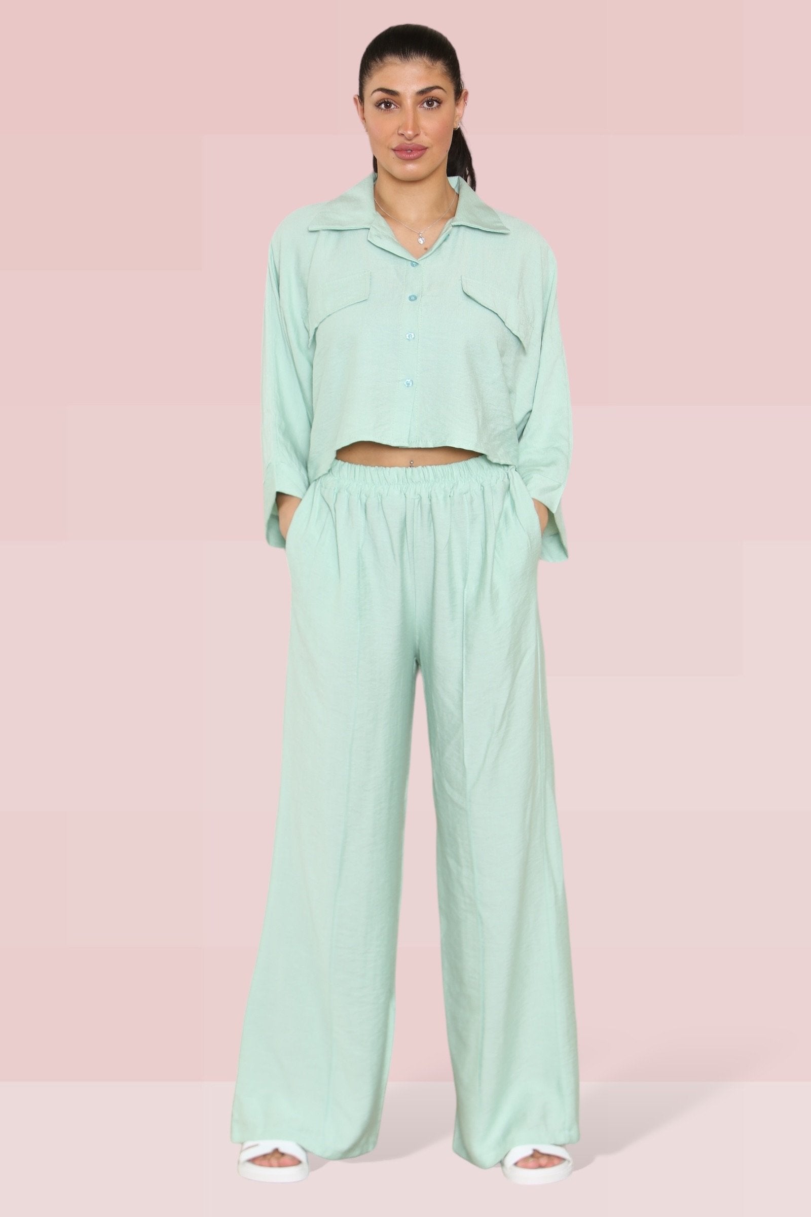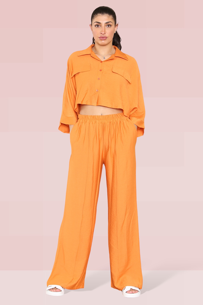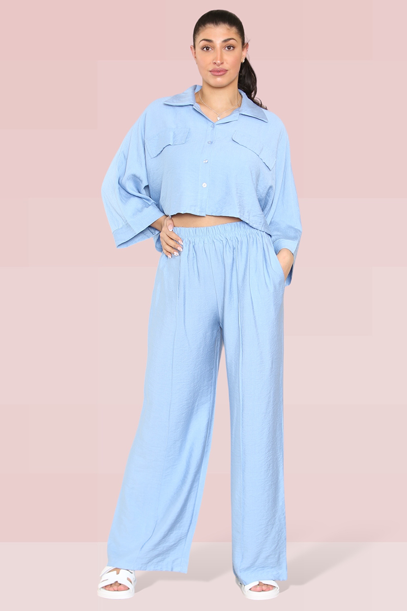 The cropped length offers a playful twist, perfectly complemented by an elastic waist that ensures both comfort and style. The lightweight fabric drapes beautifully, enhancing the wide-leg fit that’s ideal for any occasion.