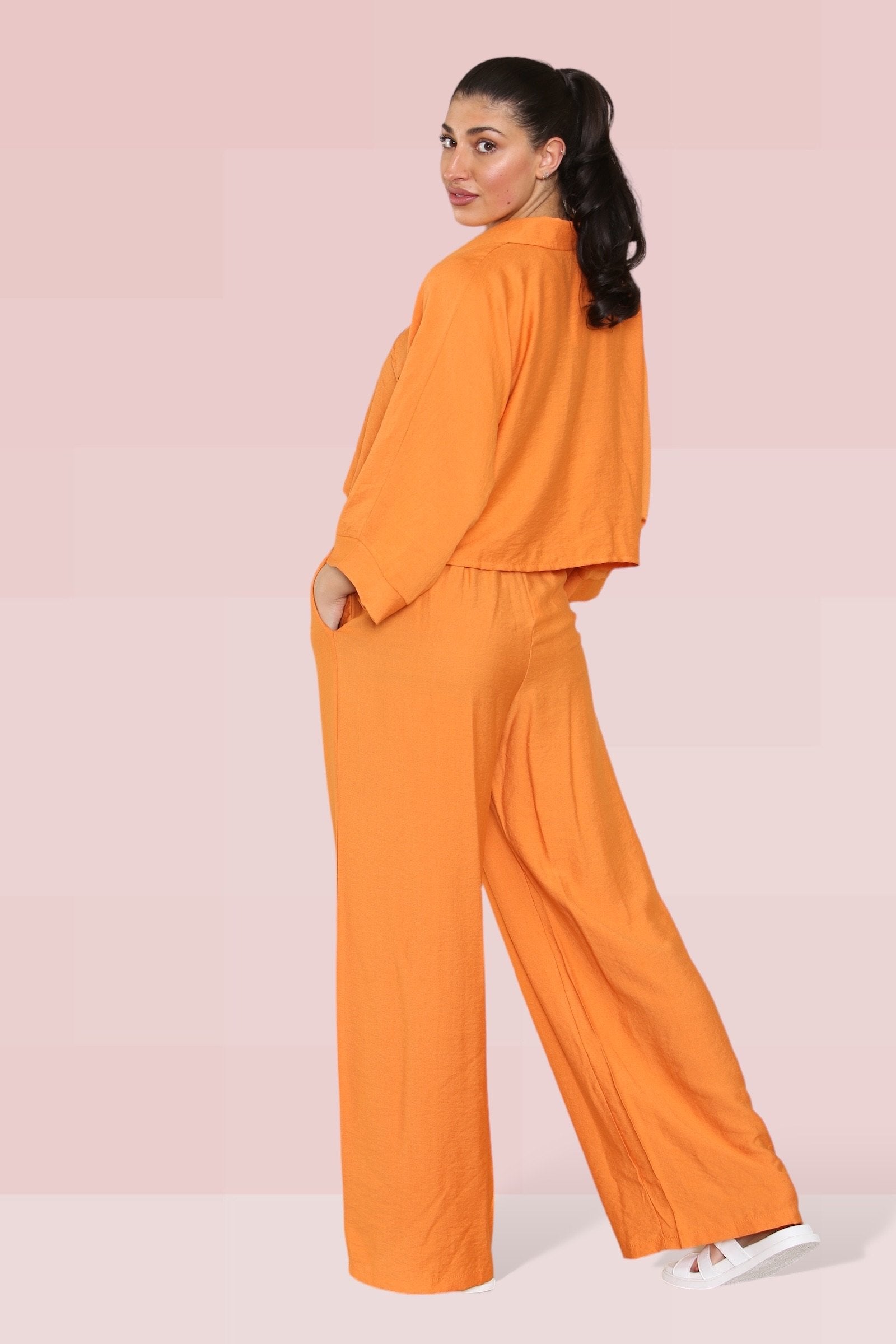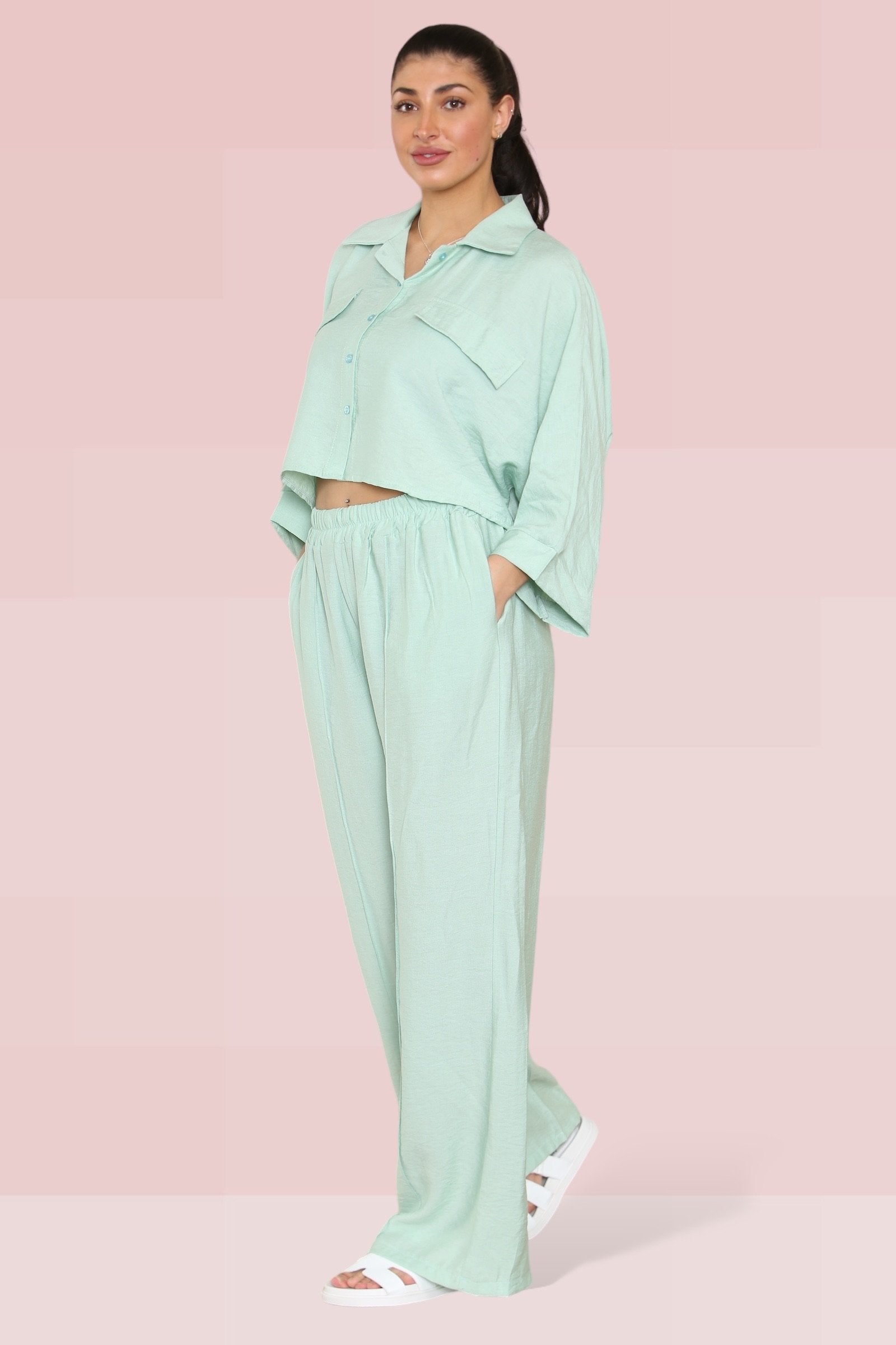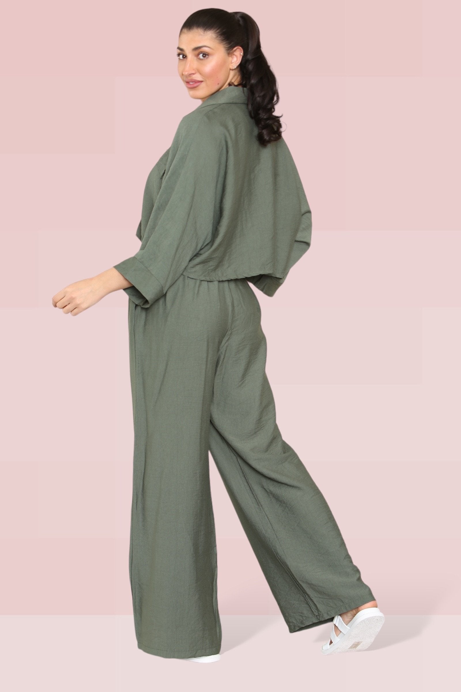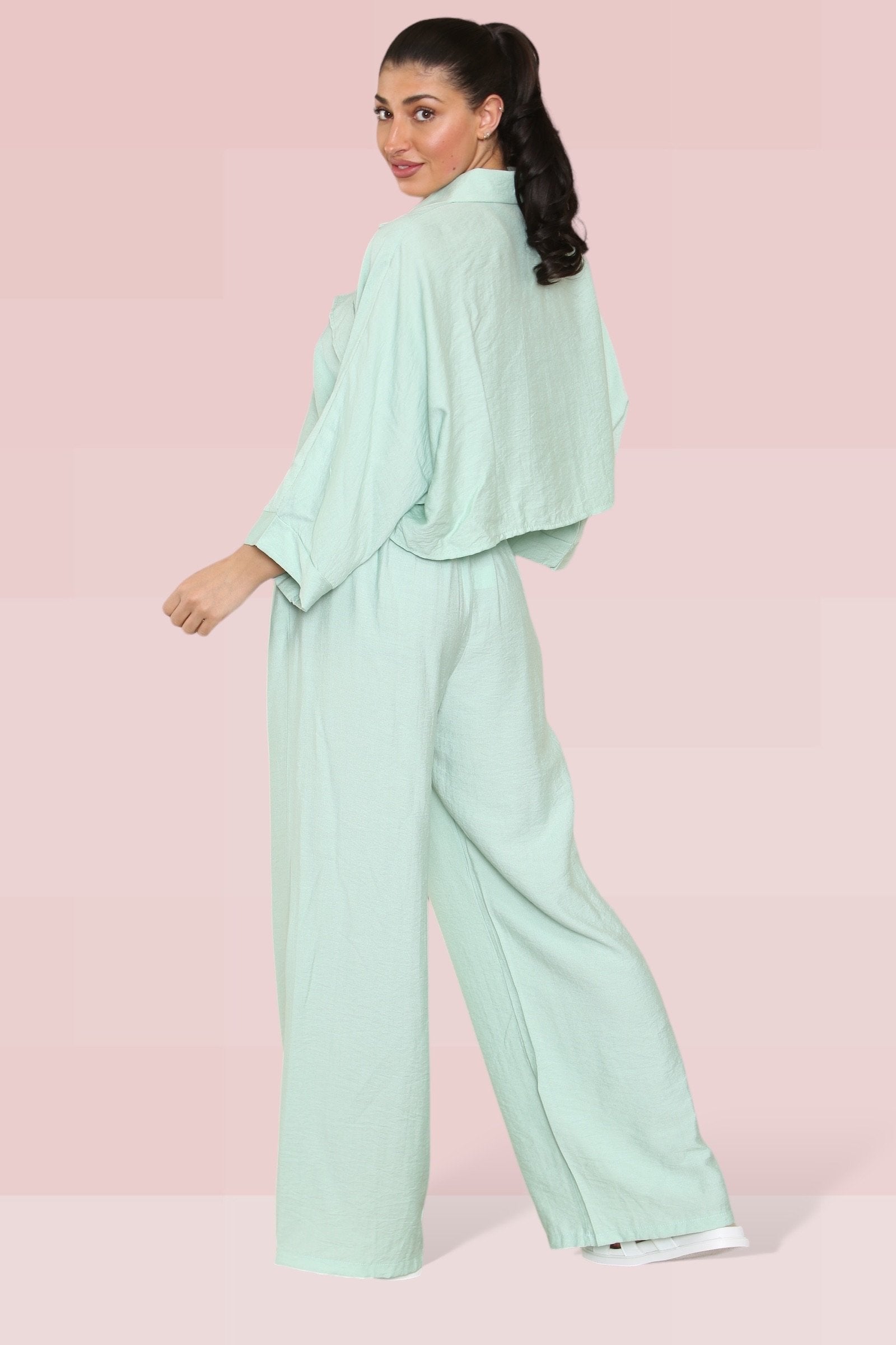 The cropped length offers a playful twist, perfectly complemented by an elastic waist that ensures both comfort and style. The lightweight fabric drapes beautifully, enhancing the wide-leg fit that’s ideal for any occasion.