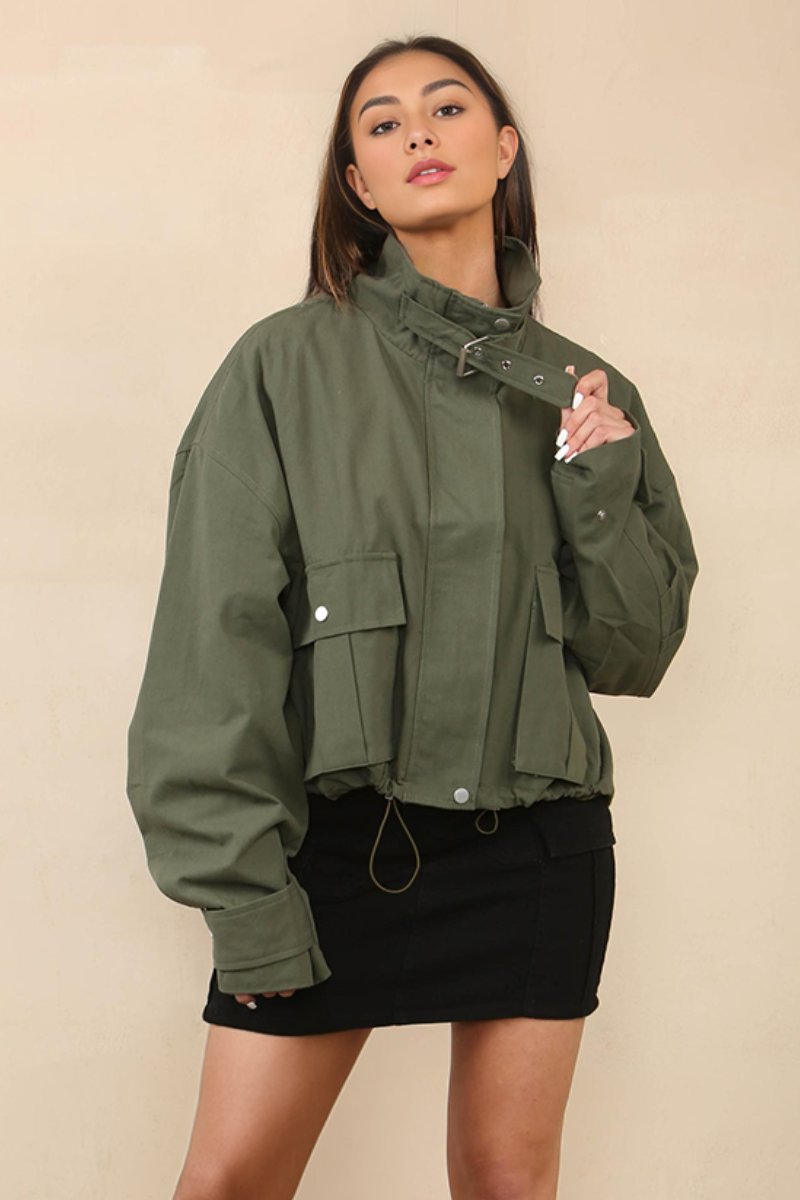 Elevate your wardrobe with this effortlessly stylish piece that’s a must-have! With its chic stand collar and elegant buckle detail, this jacket combines fashion and function.