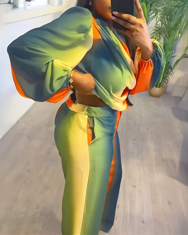 Design Details: Showcasing a soft gradient tie-dye print for a unique, artistic look. The top features puff sleeves and delicate ruching that add volume and femininity, while the pants are finished with a front zipper fly, functional pockets, and a smooth back waistband for ease and practicality.