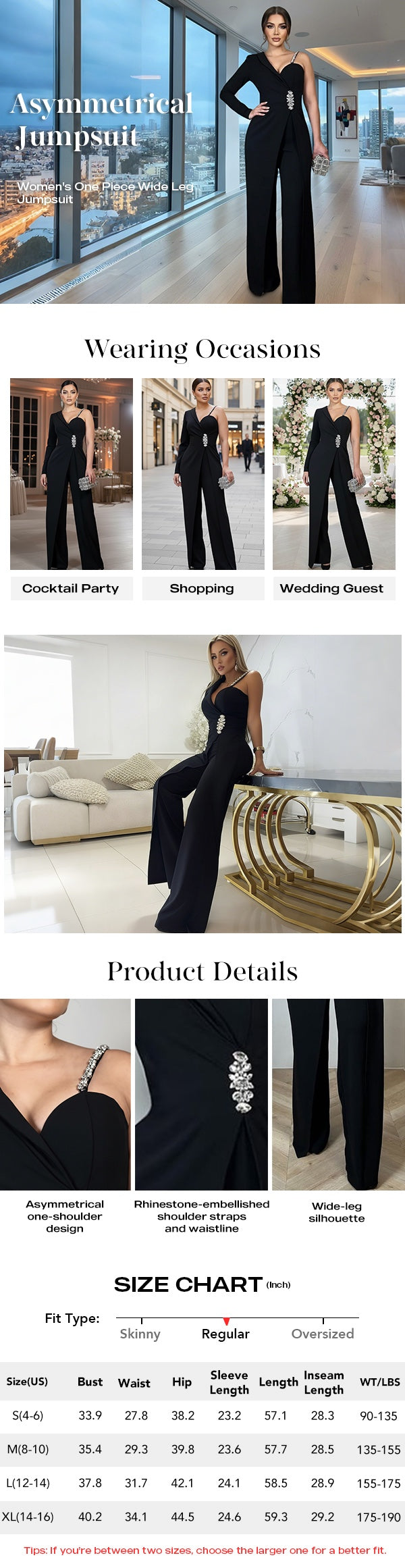 Design Details: The asymmetric one-shoulder design combines a long-sleeve blazer-style side with an adjustable rhinestone strap on the other, blending sophistication with a touch of glamour. The wrap-front bodice mimics a two-piece look, adding depth and structure, while rhinestone accents at the waist enhance refinement.