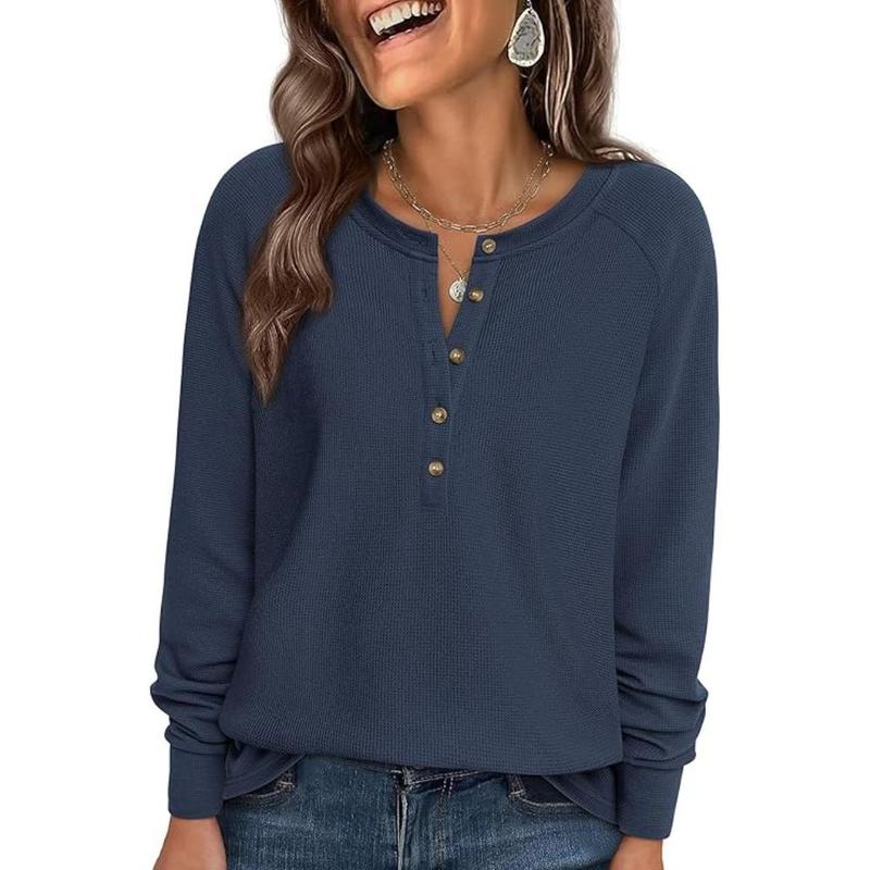 • Women's Button Up Waffle Top Long Sleeve Knit Shirts Fall Casual Henley V Neck Tunic Tops Loose Fit Basic Tees