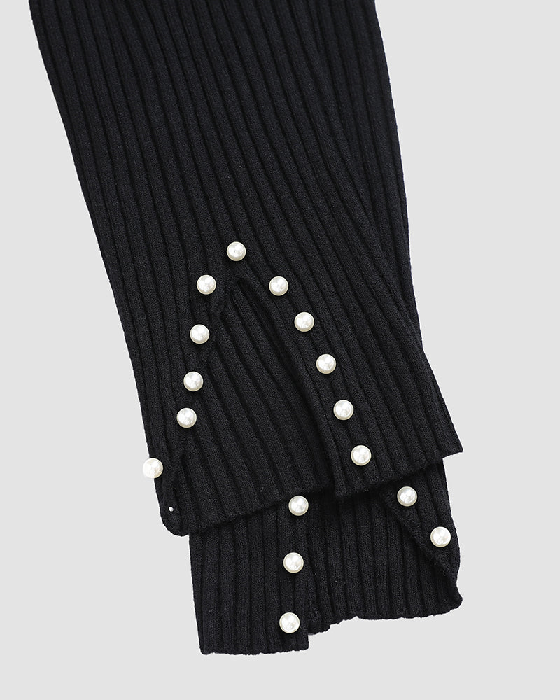 Design Details: Features a mock neck, long sleeves, hollow-out back, and side slits on both top and pants. Pearl embellishments along the neckline, cuffs, and pant hems bring refined elegance, subtly elevating the casual set.