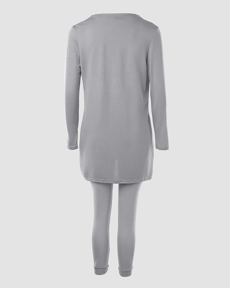 Silhouette & Fit - A regular-fit 3-piece suit set featuring a round-neck sleeveless tank, long pants, and a long open-front cardigan, delivering a clean, plain look with balanced proportions.