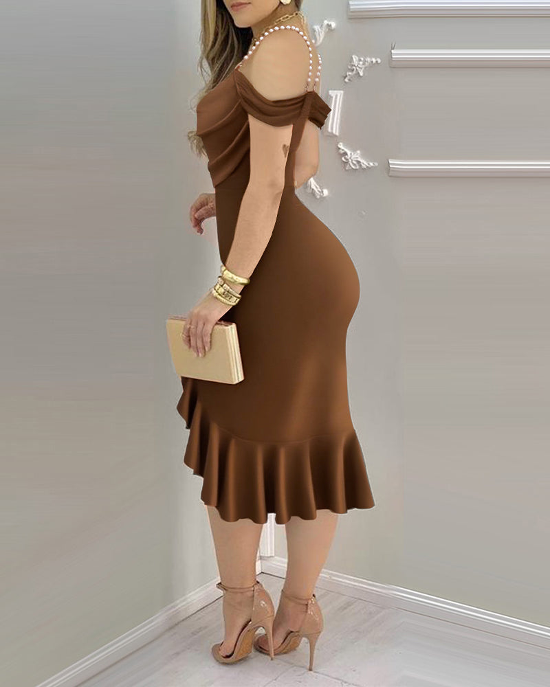 - Design Details �� Cold-shoulder pearl chain straps meet a draped cowl neckline, finished with an asymmetrical ruffle hem and subtle slit for elegant movement.