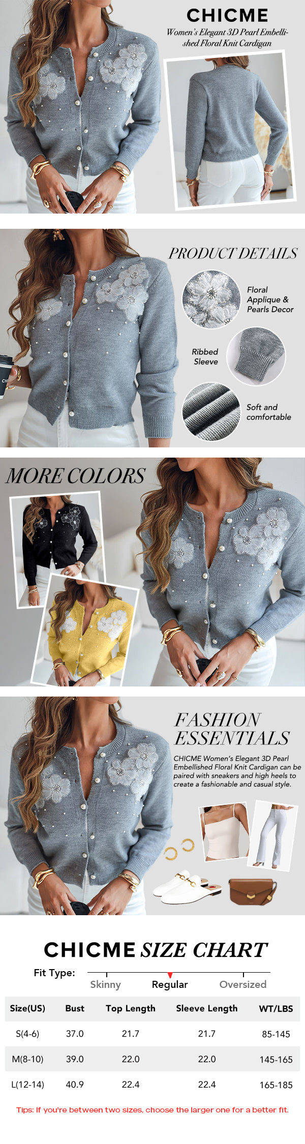 Design Details: Single-breasted cardigan with pearl-decorated buttons and 3D floral appliques, adding a delicate and feminine charm.