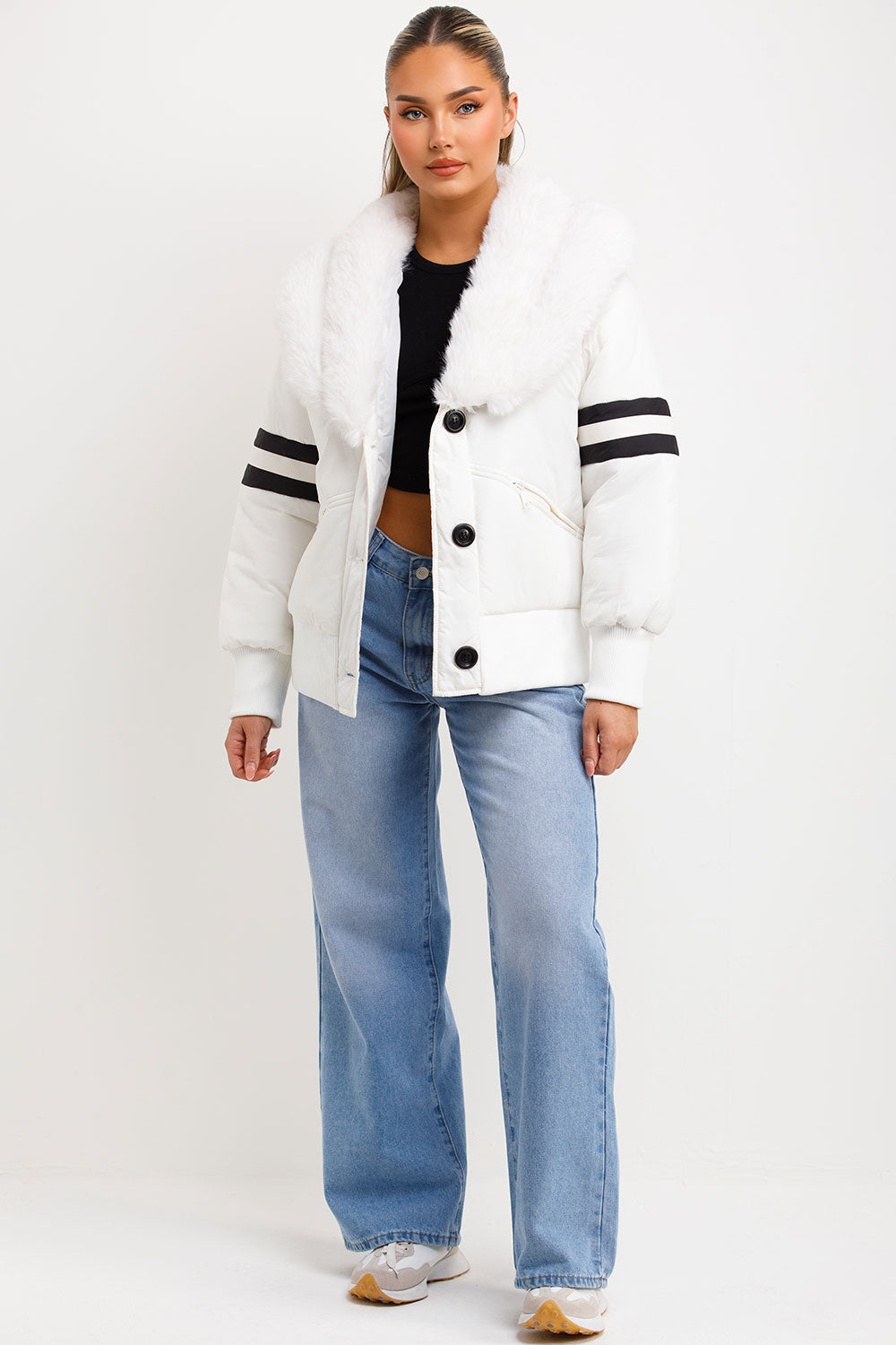 Aviator bomber jacket with faux fur and stripe detail. This faux fur collar aviator jacket is a must have for new season outerwear wardrobe. Featuring faux fur collar aviator bomber jacket with button fastening stripe detail on sleeves padded and really cosy premium quality. This faux fur collar bomber aviator jacket is sure to keep you cosy while you are out and about. This faux fur collar aviator bomber jacket is also available in other colours.