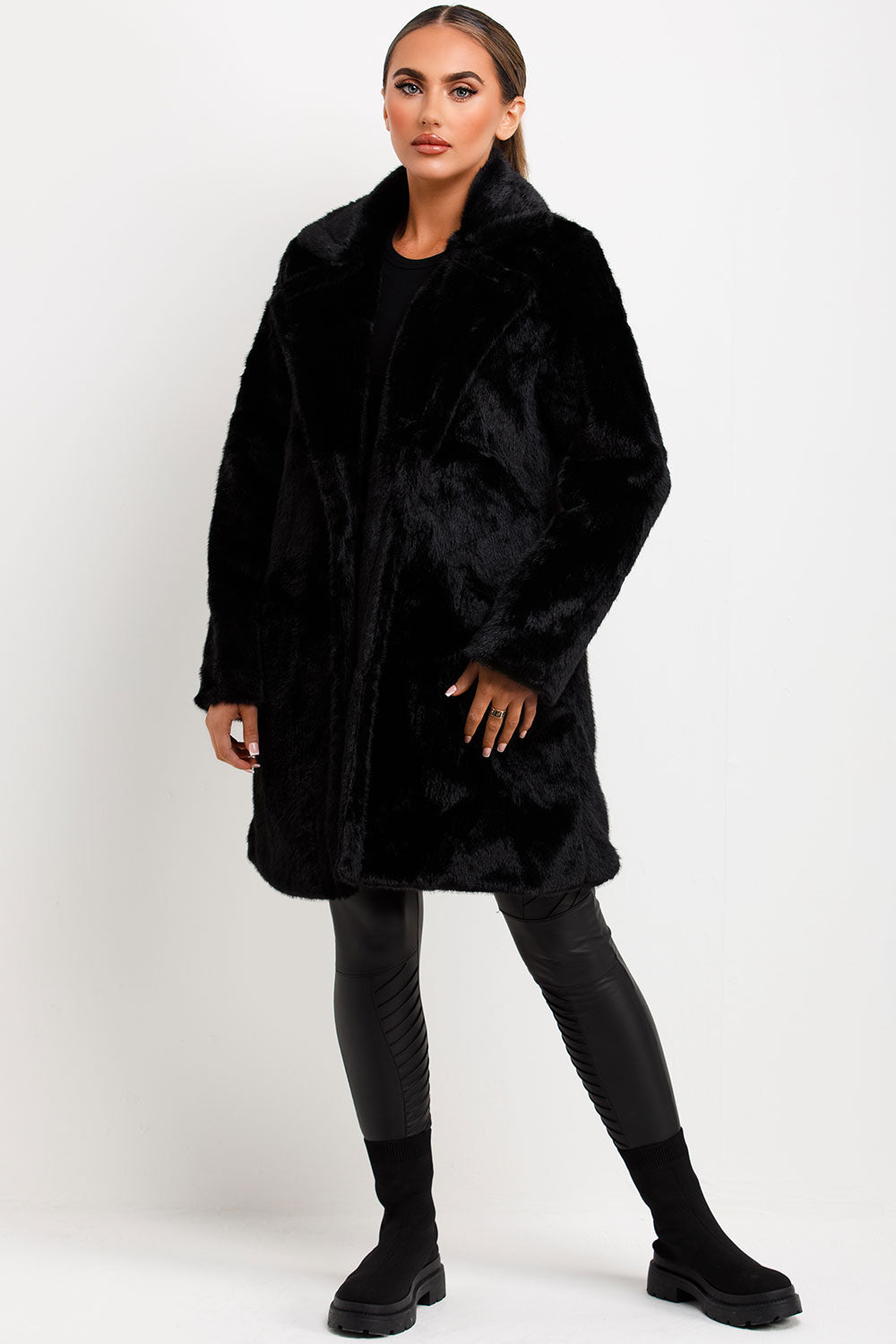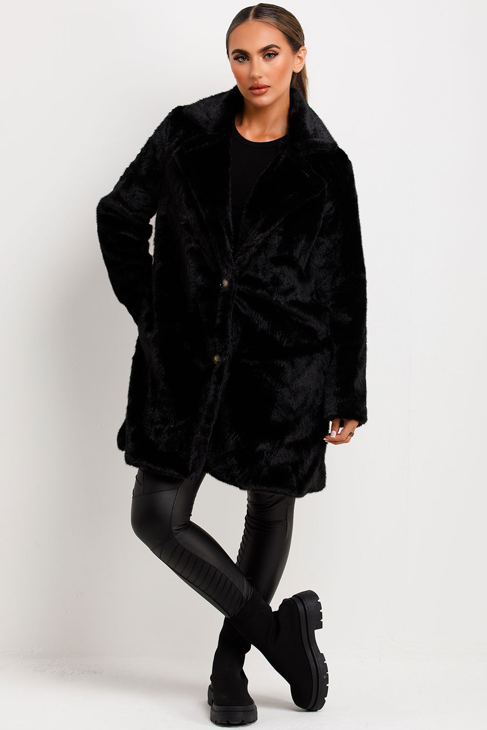 Faux fur coat with lapel collar. This faux fur coat is going to give you chic look while keeping you cosy, this fur coat is perfect for your outerwear wardrobe. Featuring faux fur coat with button fastening and lapel collar. Style this faux fur coat with any outfit to complete the look we are loving. This faux fur coat is also available in other colours.