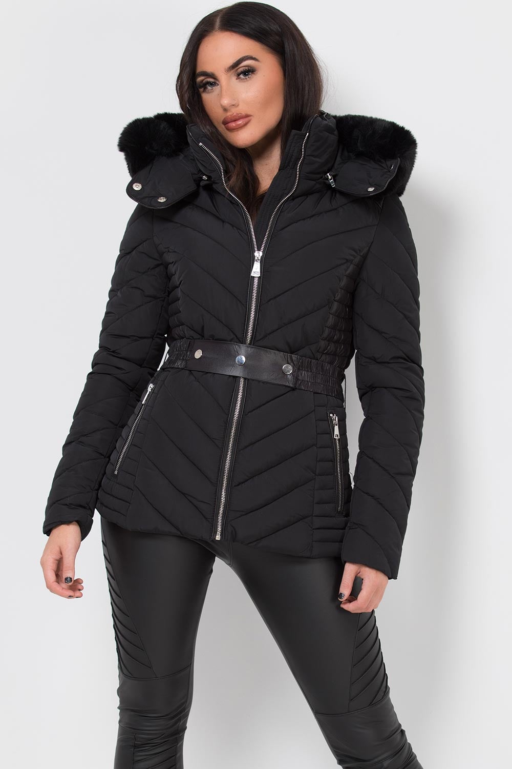 Puffer jacket with faux fur hood and elasticated waist belt. This puffer jacket is a NEED for this new season. Featuring padded puffer jacket, extremely warm with quilted side panel detail, luxury faux fur hood, elasticated waist belt, zip pockets and zip fastening. Also available in other colours.