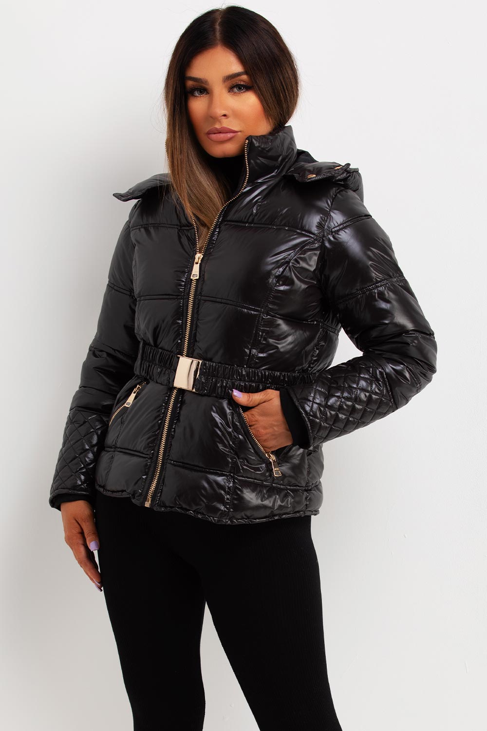 Shiny puffer jacket. This puffer jacket is sure to keep your outerwear game on point. This black puffer jacket features soft shiny fabric padded puffer quilted style hood and waist belt pockets weather resistant and wind proof. Perfect new season hooded jacket. Style this puffer jacket with matching outfit to complete the look we are loving.