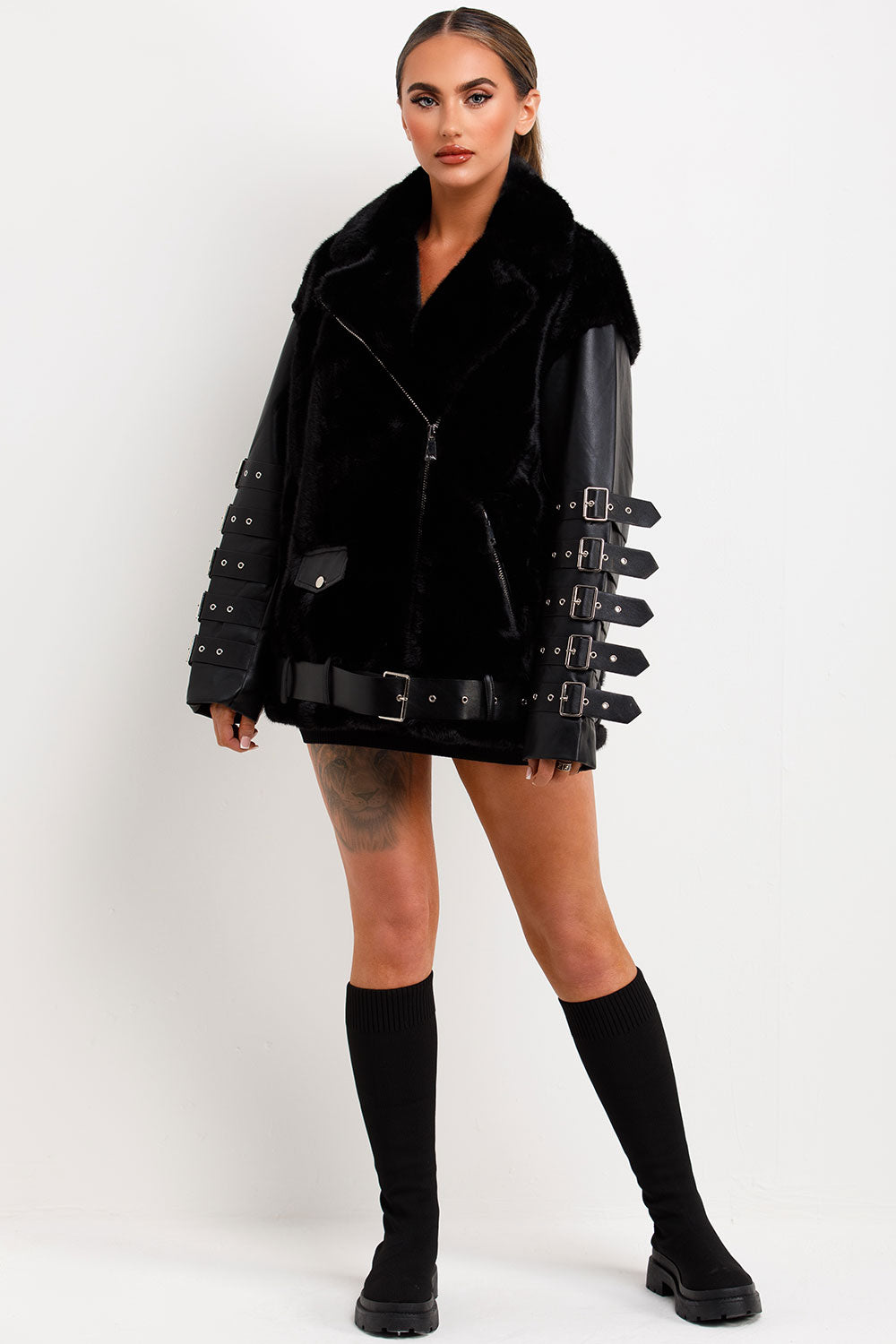 Faux fur faux leather aviator jacket with strap sleeve detail. This aviator jacket is going to give your outerwear look an edge. Featuring faux fur faux leather aviator jacket with zip fastening buckle detail on sleeves lapel collar pockets and belted hem, premium quality. Style this faux leather faux fur aviator jacket with matching accessories to complete the look we are loving. This faux fur faux leather aviator jacket is also available in other colours.