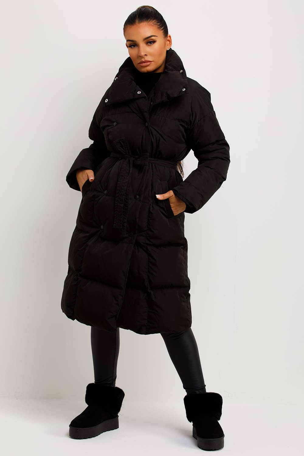 Long puffer coat duvet style. This long puffer duvet coat is sure to become your everyday go to outfit piece in this new season. Featuring long puffer coat with button fastening duvet style adjustable waist belt windproof weather resistant and with pockets. Style this long coat on top of any outfit to complete your outerwear look. This long padded puffer duvet coat is also available in other colours.