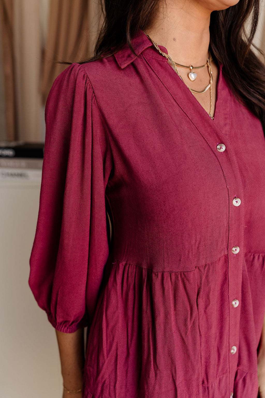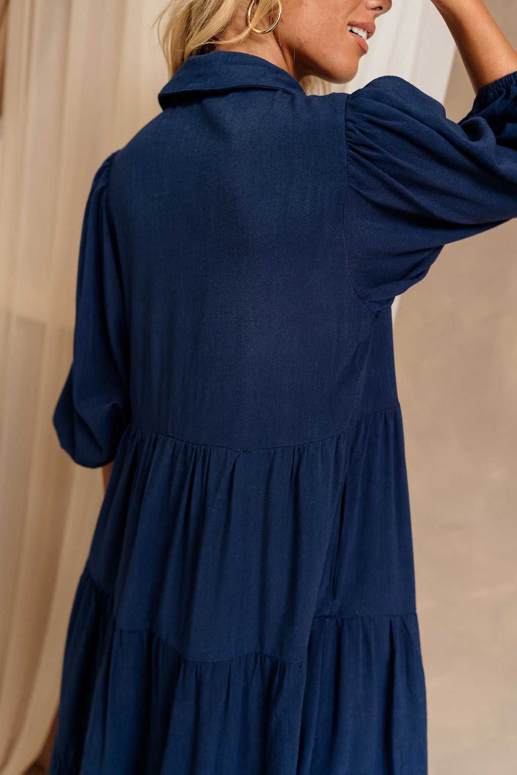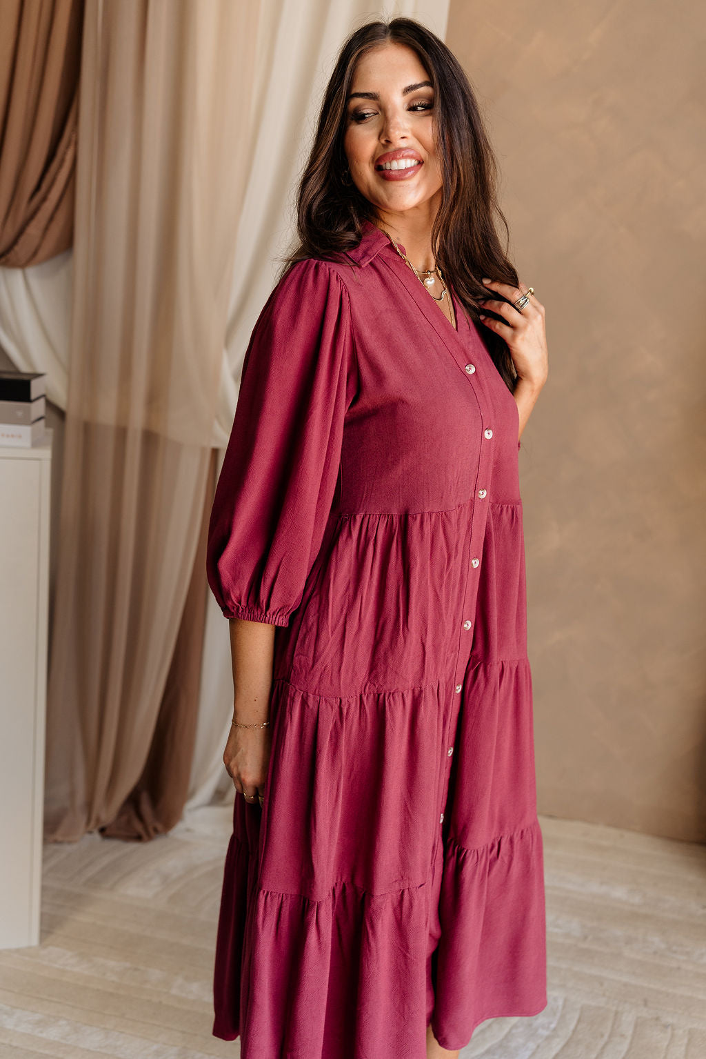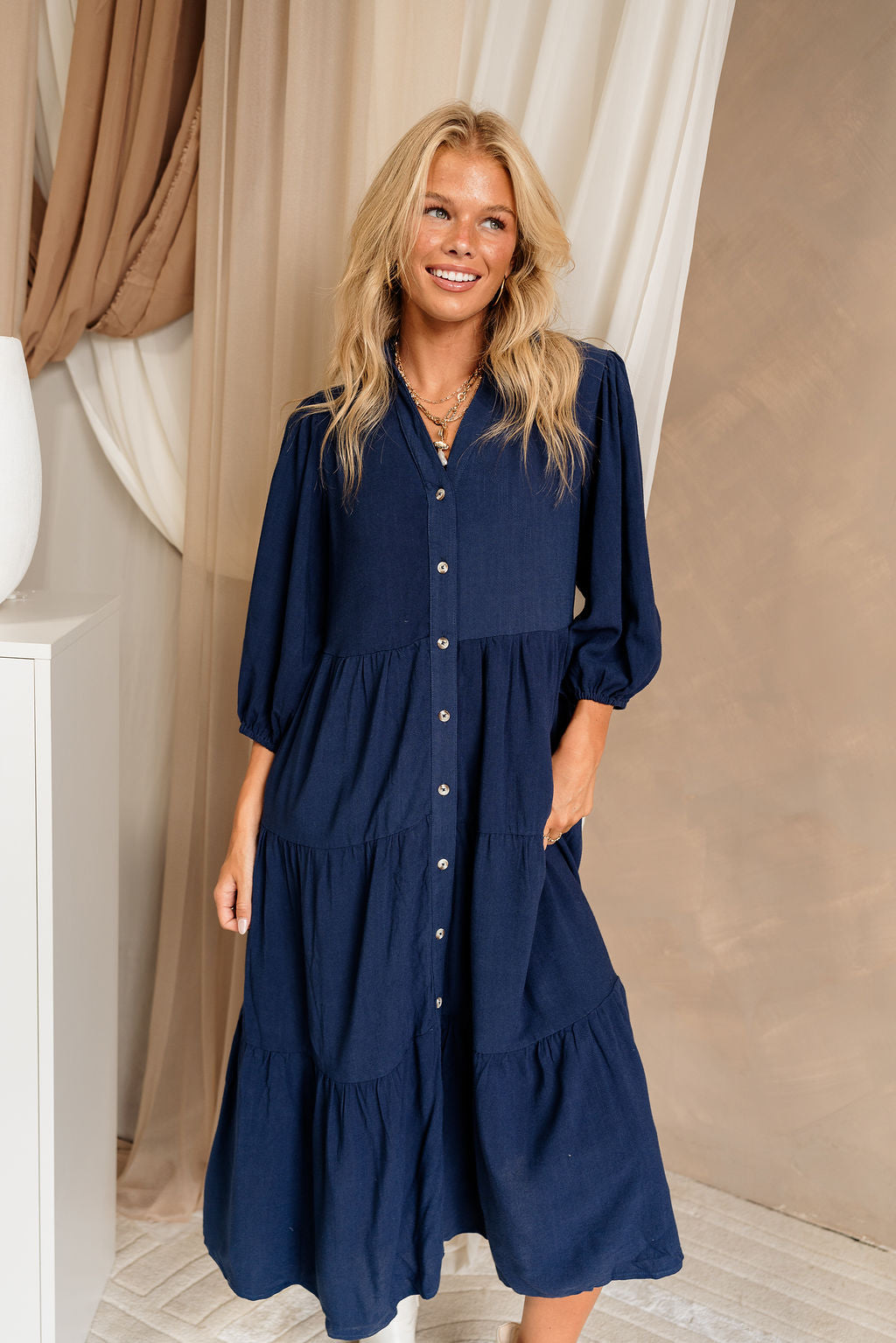 Introducing the Penny Button Up 3/4 Sleeve Midi Dress, a versatile and stylish addition to your wardrobe. Available in navy or berry, this dress features a classic button-up front and a chic collar for a timeless look. The 3/4 sleeves add a touch of sophistication, while the side pockets provide practical convenience. The tiered skirt offers a flattering silhouette that moves gracefully with you. Perfect for any occasion, the Penny Dress combines elegance and functionality effortlessly.