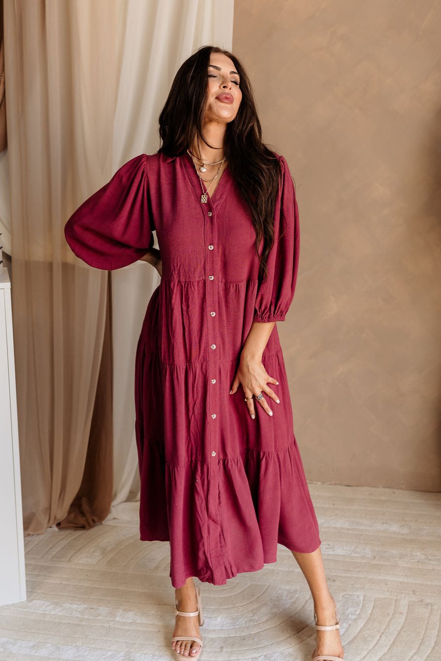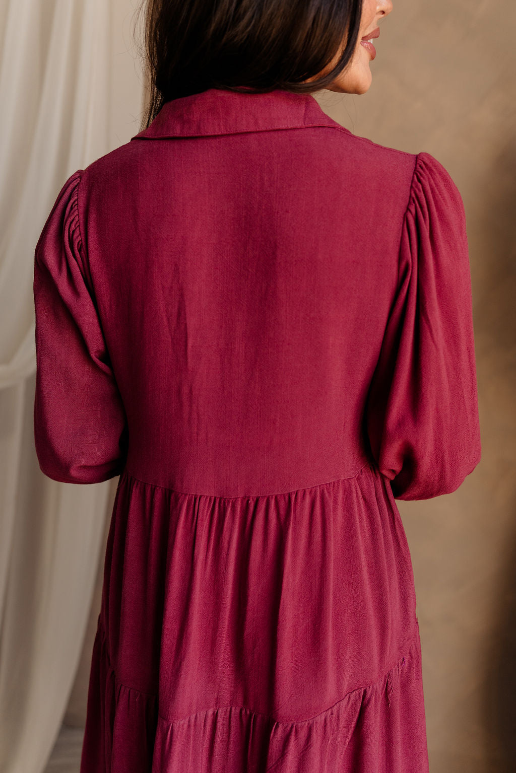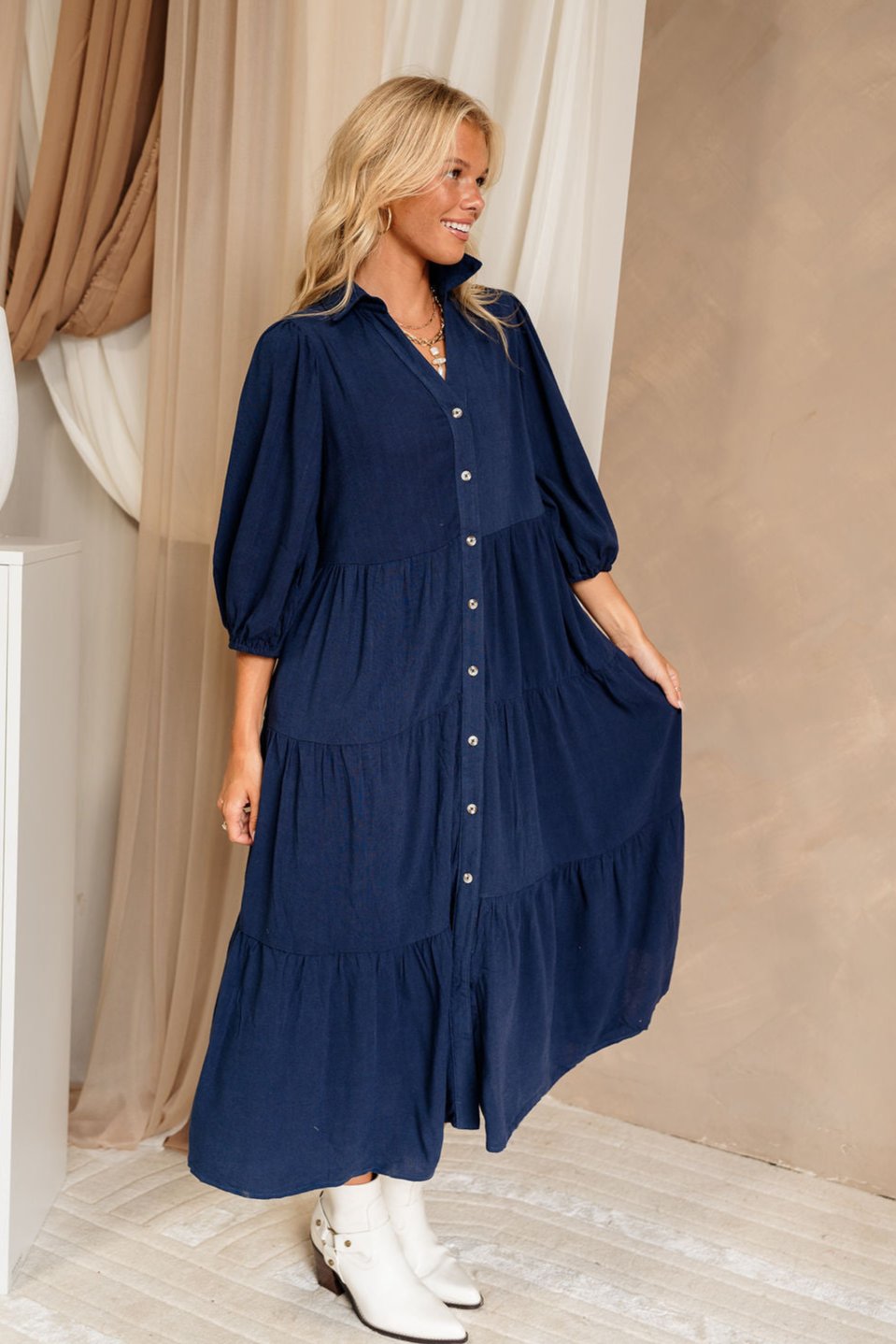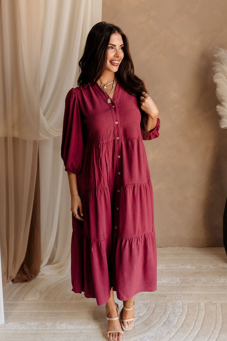 Introducing the Penny Button Up 3/4 Sleeve Midi Dress, a versatile and stylish addition to your wardrobe. Available in navy or berry, this dress features a classic button-up front and a chic collar for a timeless look. The 3/4 sleeves add a touch of sophistication, while the side pockets provide practical convenience. The tiered skirt offers a flattering silhouette that moves gracefully with you. Perfect for any occasion, the Penny Dress combines elegance and functionality effortlessly.