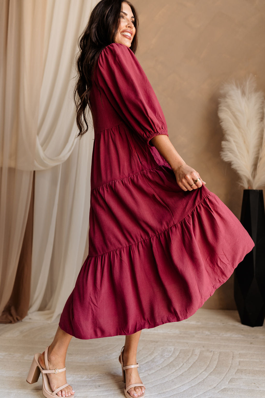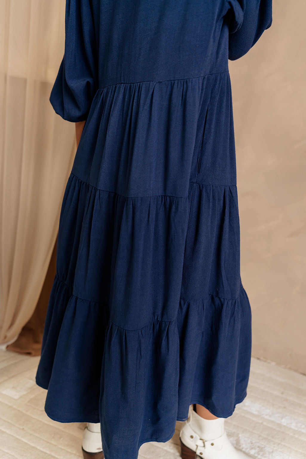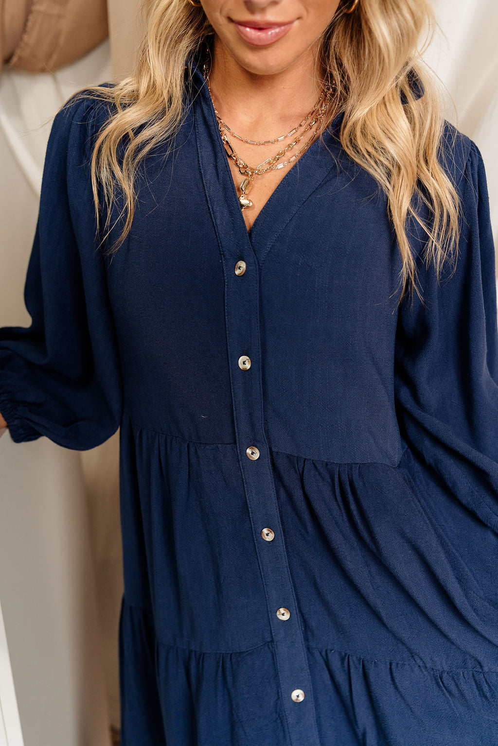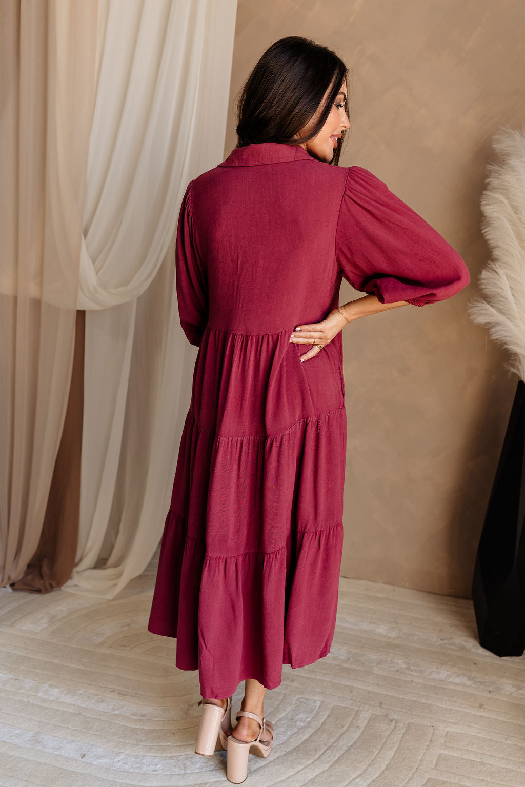 Introducing the Penny Button Up 3/4 Sleeve Midi Dress, a versatile and stylish addition to your wardrobe. Available in navy or berry, this dress features a classic button-up front and a chic collar for a timeless look. The 3/4 sleeves add a touch of sophistication, while the side pockets provide practical convenience. The tiered skirt offers a flattering silhouette that moves gracefully with you. Perfect for any occasion, the Penny Dress combines elegance and functionality effortlessly.