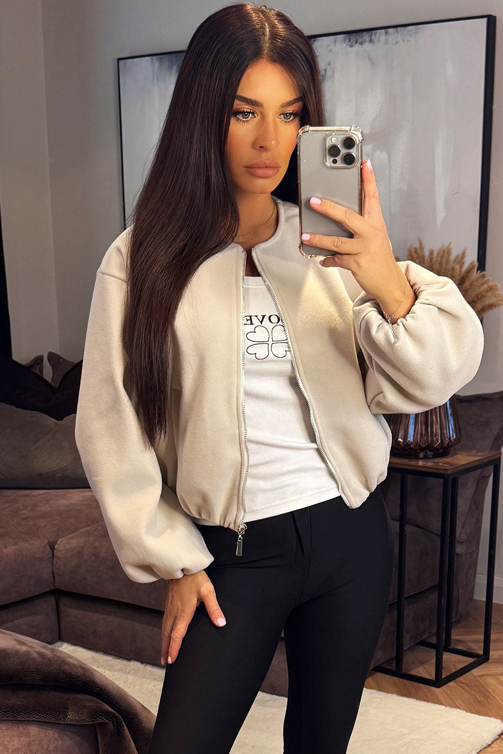 Soft bomber jacket. This bomber jacket is a must have for your new season outerwear wardrobe. Featuring soft bomber jacket with round neck elastic cuffs long sleeves pockets on front elasticated hem and zip up front. Style this bomber jacket with any outfit to complete the look we are loving. This soft bomber jacket is also available in other colours.