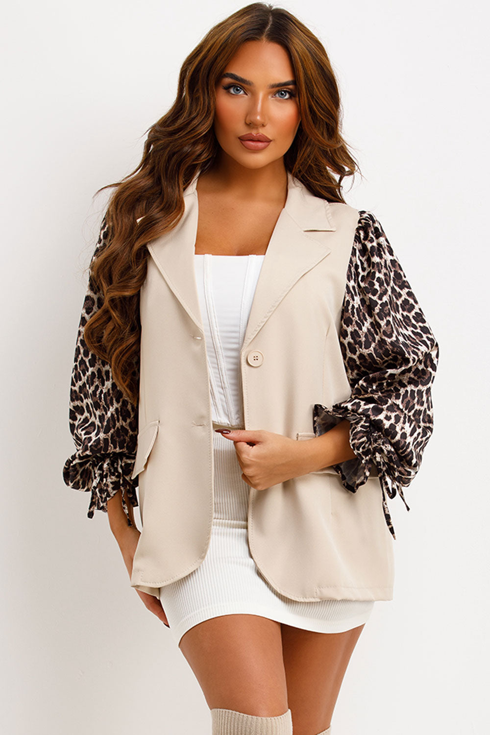 Blazer with satin leopard print sleeves. This leopard print contrast blazer is going to cover you for all events from day to night. Featuring blazer jacket with button fastening and satin leopard print sleeves with tie detail. This leopard print sleeve blazer is perfect to finish off any outfit , style this leopard sleeve blazer jacket with matching accessories to complete the look we are loving. This leopard print sleeve blazer jacket is also available in other colours.