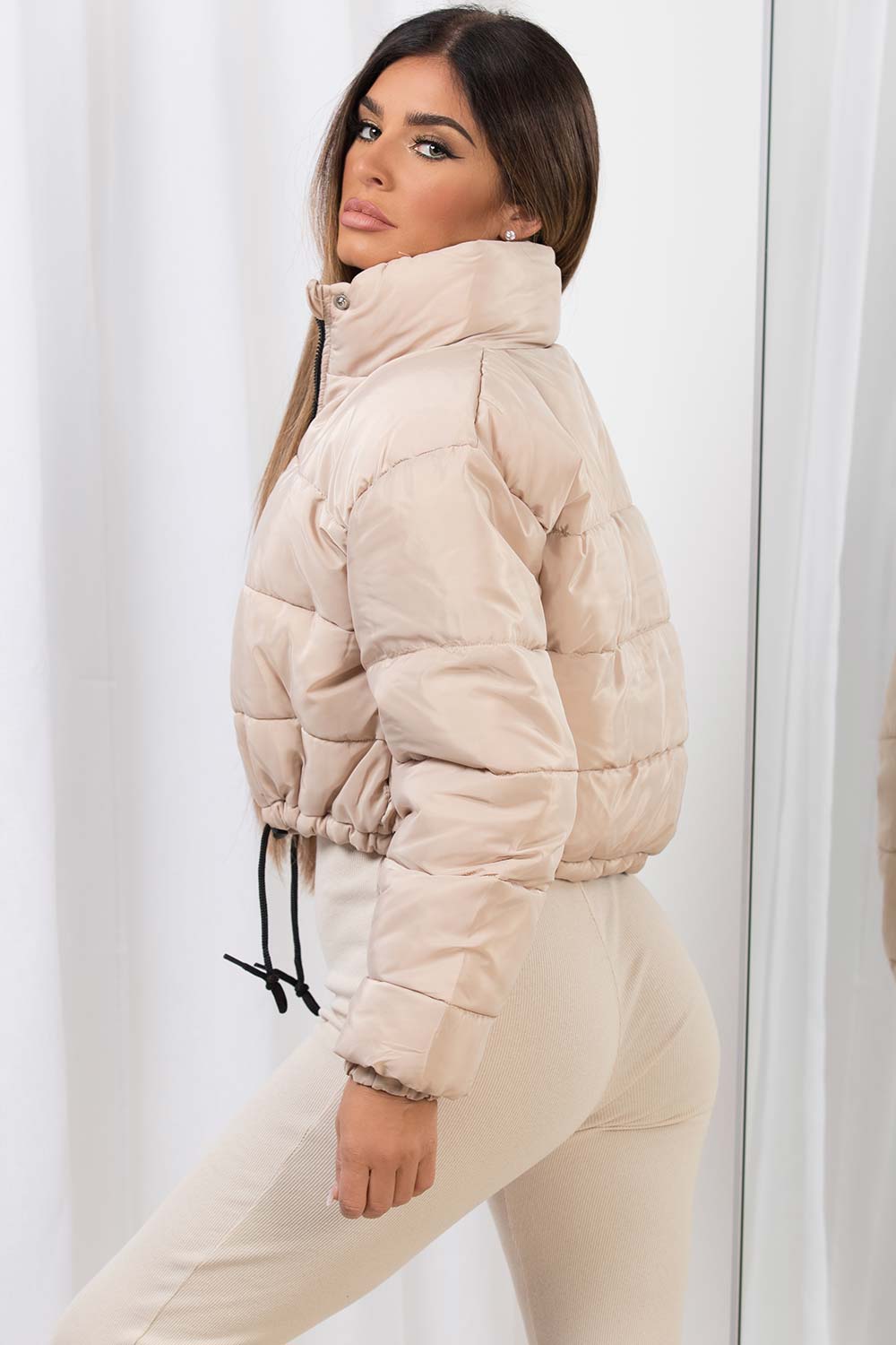 Crop puffer jacket with drawstring. This puffer jacket is perfect for your outerwear collection. Featuring puffer padded style with adjustable drawstring. Wear it with our high waisted jeans and crop top to complete the look. Also available in Khaki and Grey.
