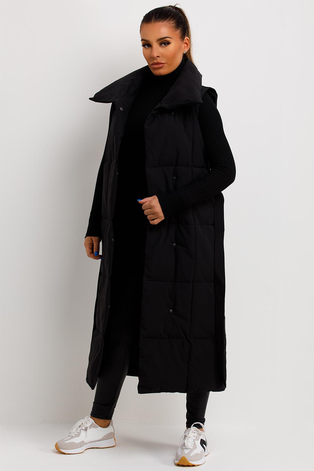 Longline duvet padded gilet. This duvet long gilet is going to make your new season look on point. Featuring trendy duvet style long puffer gilet with stud button and belt fastening , weather resistant windproof and pockets. Style this long puffer gilet with our knitwear and leather look leggings to complete the look we are loving. This duvet longline gilet is also available in other colours.