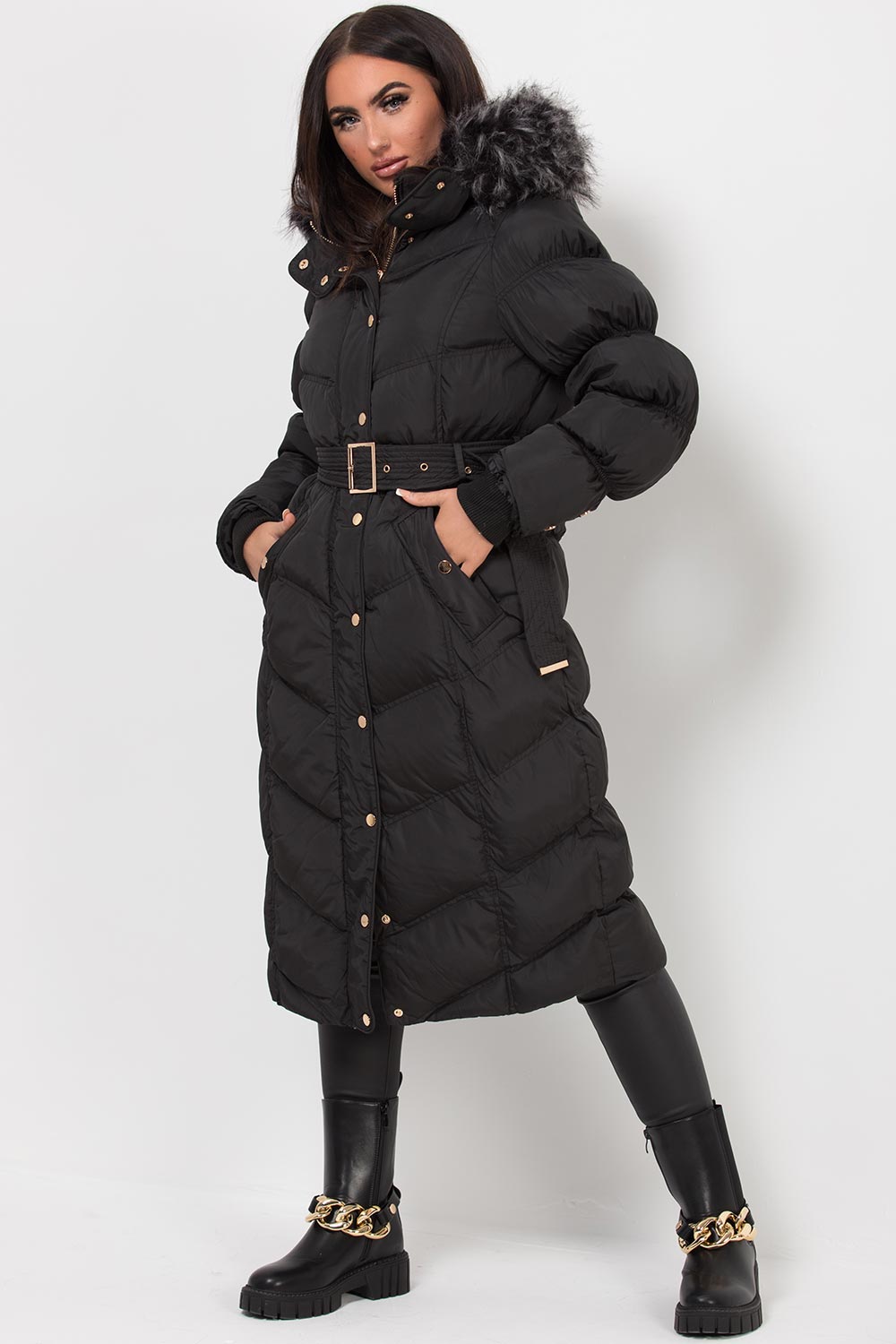 Long puffer padded coat with fur hood and belt. This puffer coat is a must have for your outdoor wardrobe. This long padded puffer coat features hood with faux fur trim extremely warm weather resistant zip stud fastening and adjustable waist belt. Style it with our leather look leggings to complete the look we are loving. Also available in Grey.