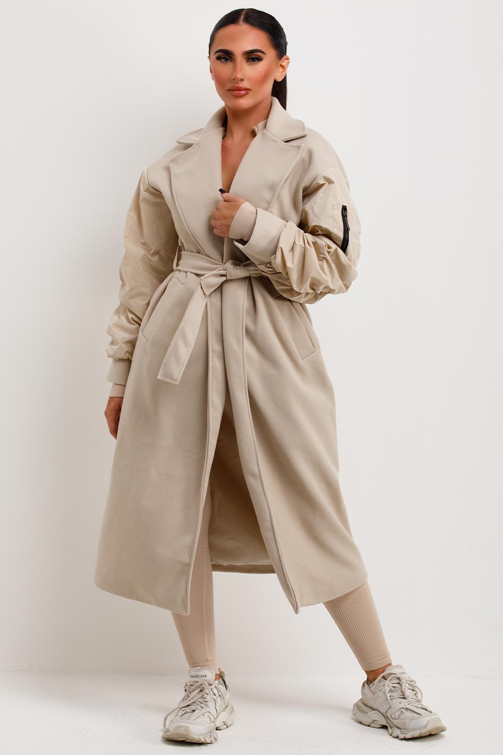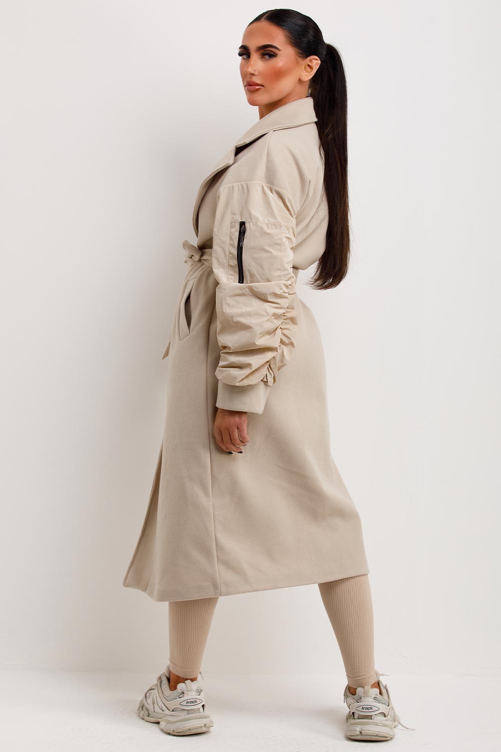 Wrap coat with ruched sleeves. This longline wool warp coat is essential for your new season look. Featuring longline warp coat with belt fastening ruched satin sleeves with zip detail and lapel collar. Style this wrap coat with our ribbed unitard to complete the ultimate cool cosy look. This long wrap coat is also available in other colours.