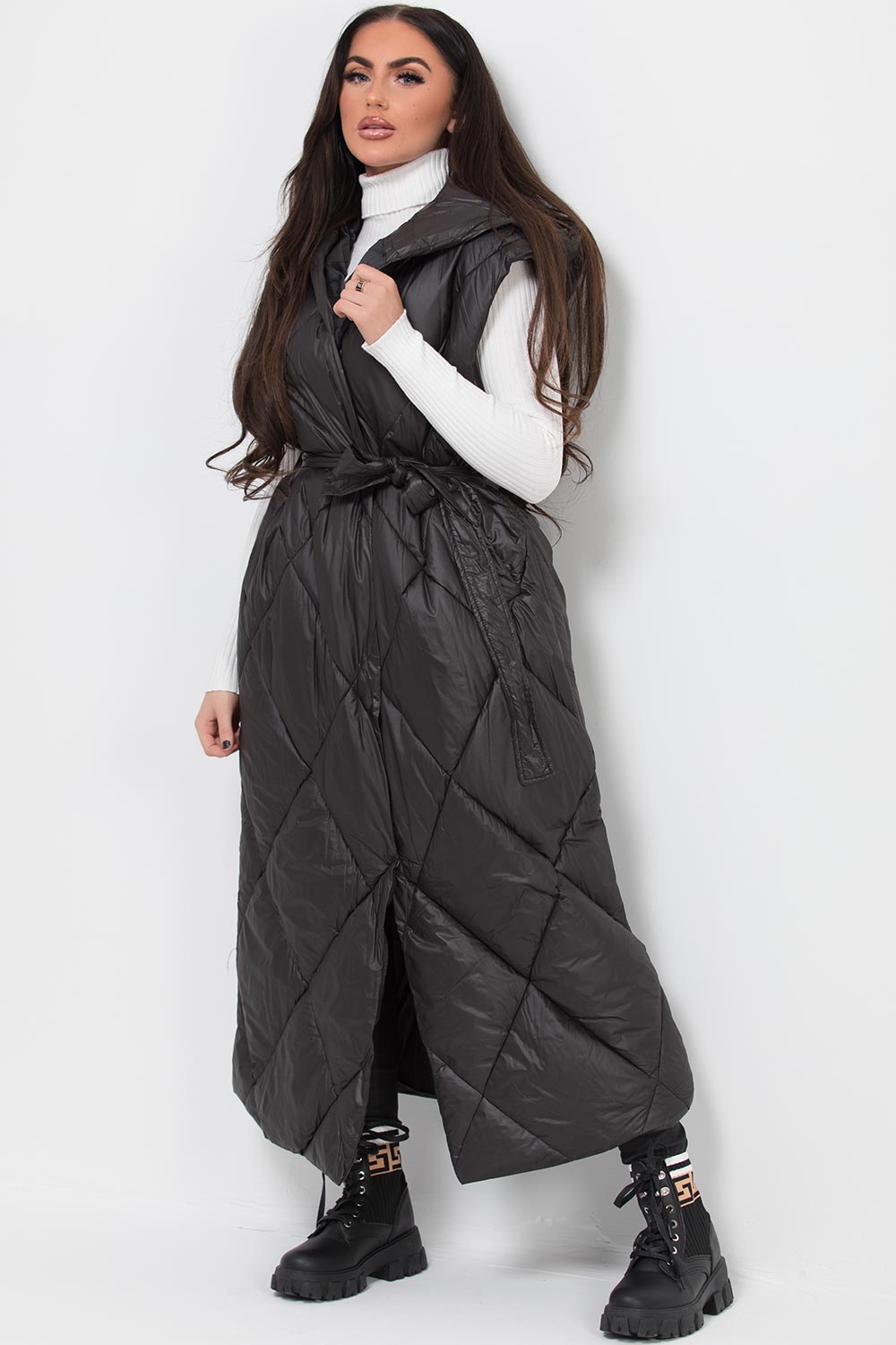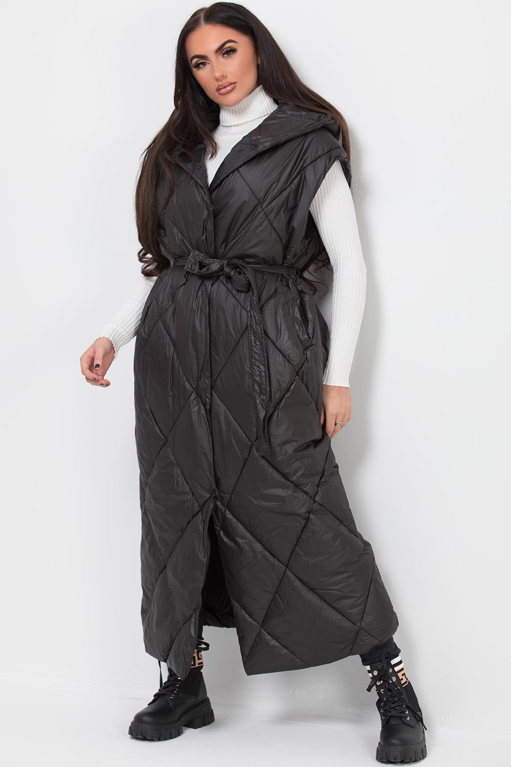 Black puffer quilted gilet with hood. This black gilet is perfect to go on top of any outfit. This long gilet bodywarmer features quilted oversized fit with button and waist belt fastening. Style it with our roll neck top and leather look leggings to complete the look.