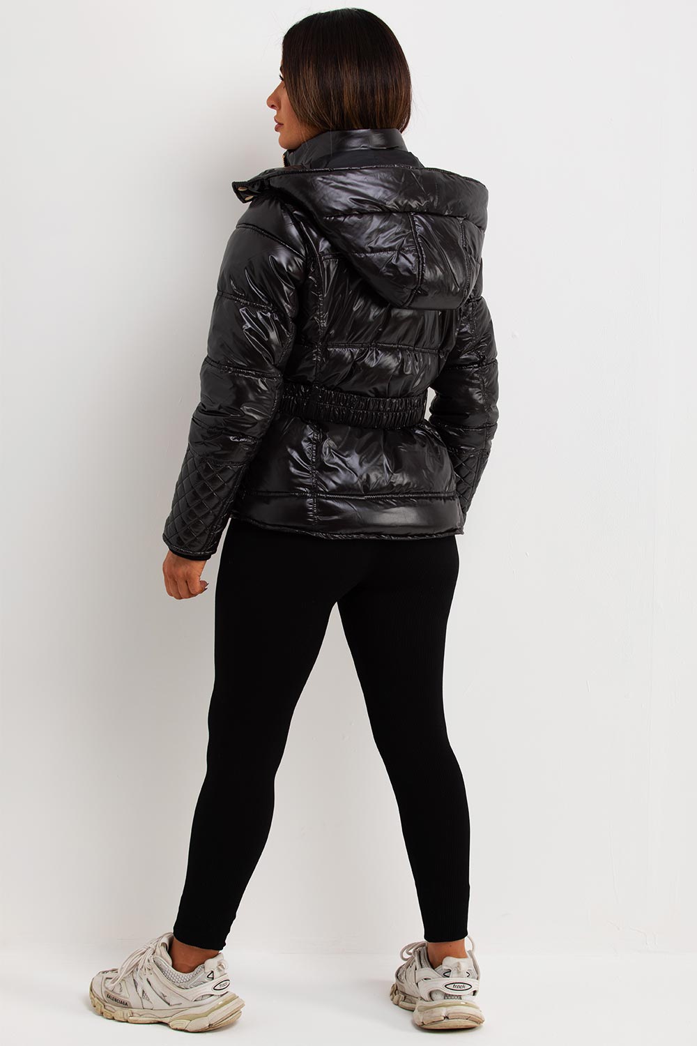Shiny puffer jacket. This puffer jacket is sure to keep your outerwear game on point. This black puffer jacket features soft shiny fabric padded puffer quilted style hood and waist belt pockets weather resistant and wind proof. Perfect new season hooded jacket. Style this puffer jacket with matching outfit to complete the look we are loving.