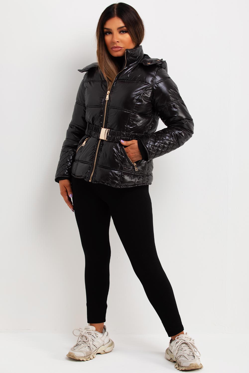Shiny puffer jacket. This puffer jacket is sure to keep your outerwear game on point. This black puffer jacket features soft shiny fabric padded puffer quilted style hood and waist belt pockets weather resistant and wind proof. Perfect new season hooded jacket. Style this puffer jacket with matching outfit to complete the look we are loving.