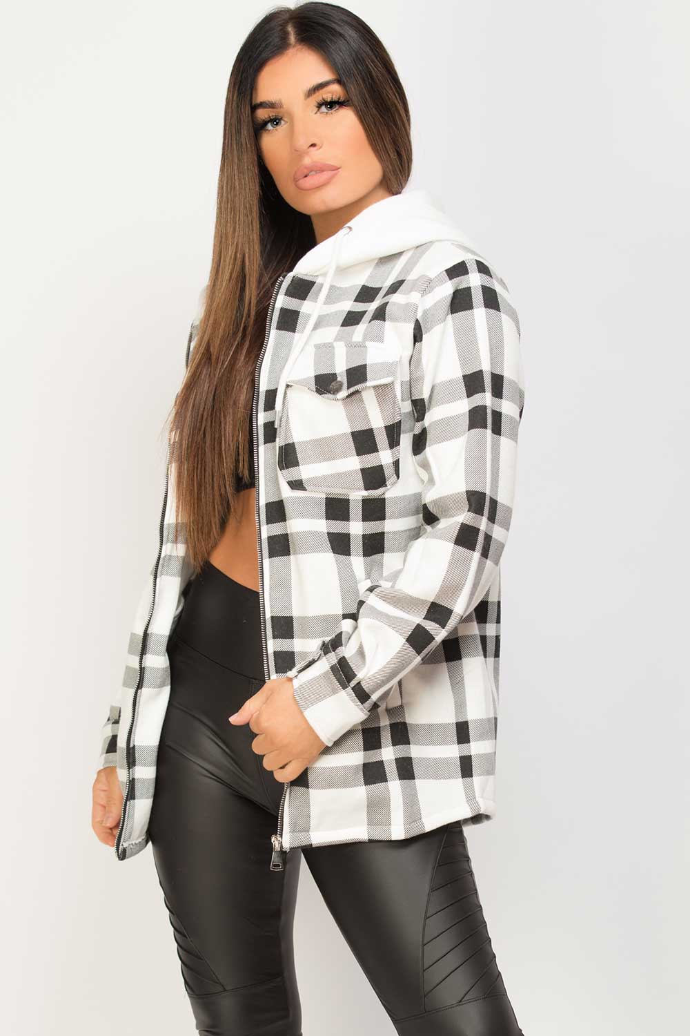 Check hooded shacket in black and white, oversized fit, zip fastening, pockets and contrast hood with drawstrings. Style it with our distressed high waisted jeans and sock boots to complete the look we are loving. Also available in other colours.