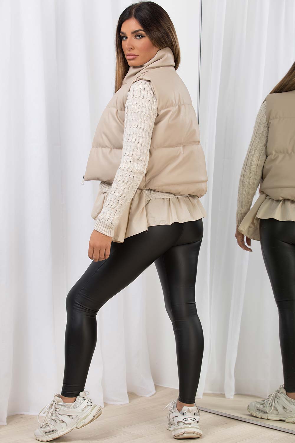 Crop gilet in faux leather. This puffer gilet will amp up any outfit you style it with. Featuring faux leather crop puffer padded gilet with zip fastening. Style it with our knitwear and leather look leggings to complete the look. Also available in other colours.
