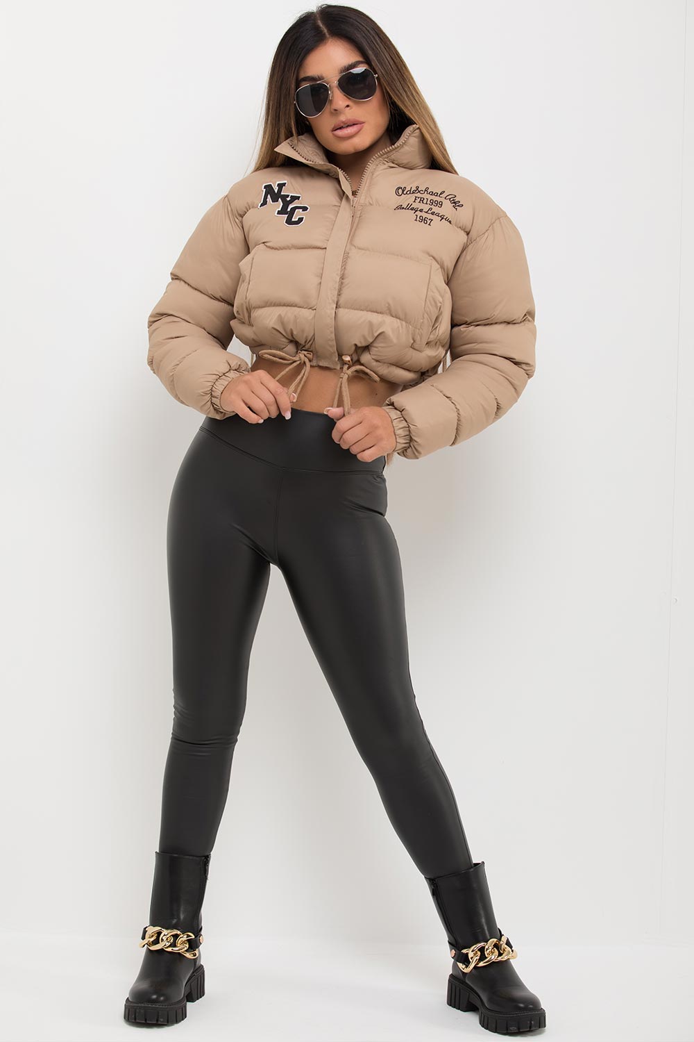 Crop puffer jacket with NYC embroidery detail and drawstring waist. A puffer jacket is a must have essential for every babes wardrobe. Featuring crop padded puffer jacket with adjustable drawstring waist side pockets and embroidery detail. Style it with our crop top and high waisted leggings to complete the look we are loving. Also available in Black.