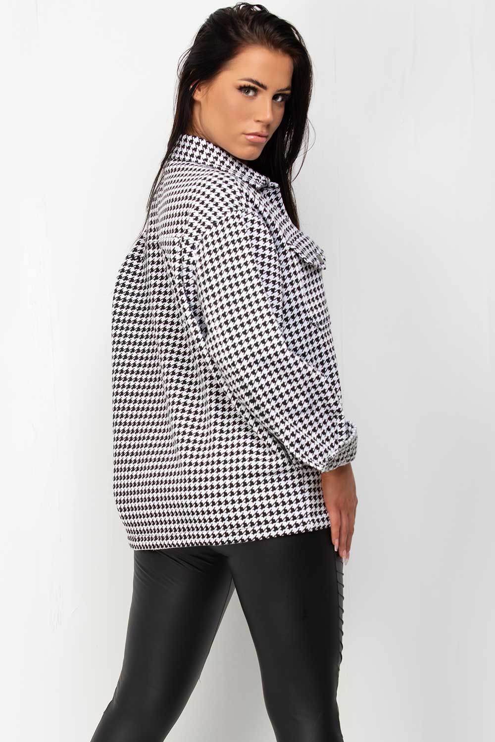 Dogtooth shacket in black and white. This shacket jacket is ticking all the right boxes for becoming everyday wardrobe essential. Featuring oversized fit, pockets and front button fastening. Style it with your everyday pieces for cool casual looks.