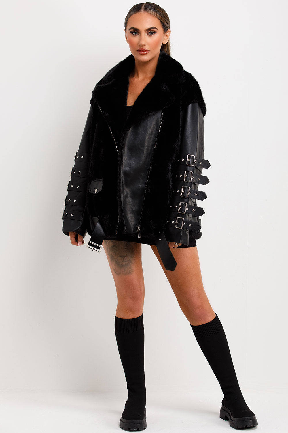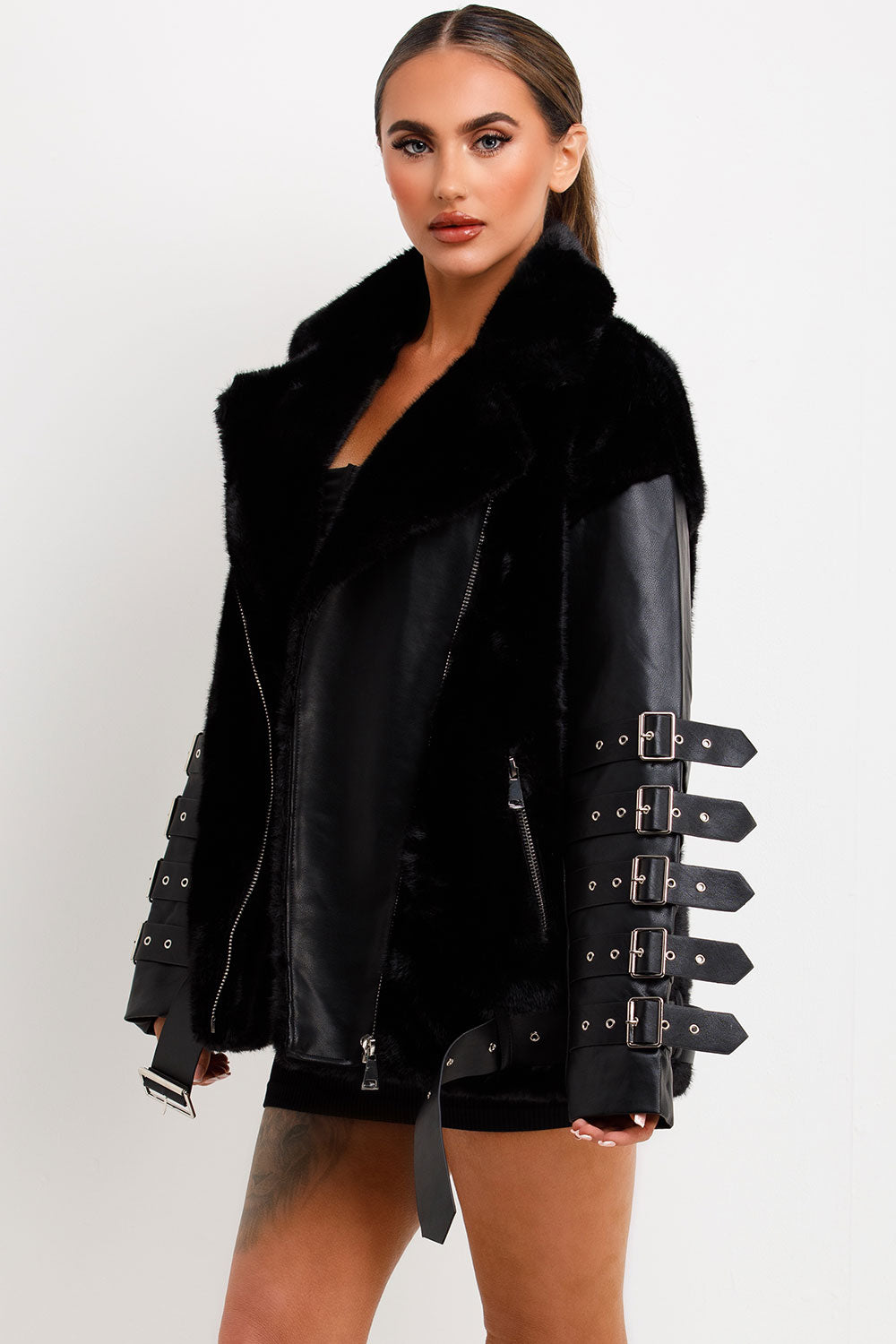 Faux fur faux leather aviator jacket with strap sleeve detail. This aviator jacket is going to give your outerwear look an edge. Featuring faux fur faux leather aviator jacket with zip fastening buckle detail on sleeves lapel collar pockets and belted hem, premium quality. Style this faux leather faux fur aviator jacket with matching accessories to complete the look we are loving. This faux fur faux leather aviator jacket is also available in other colours.