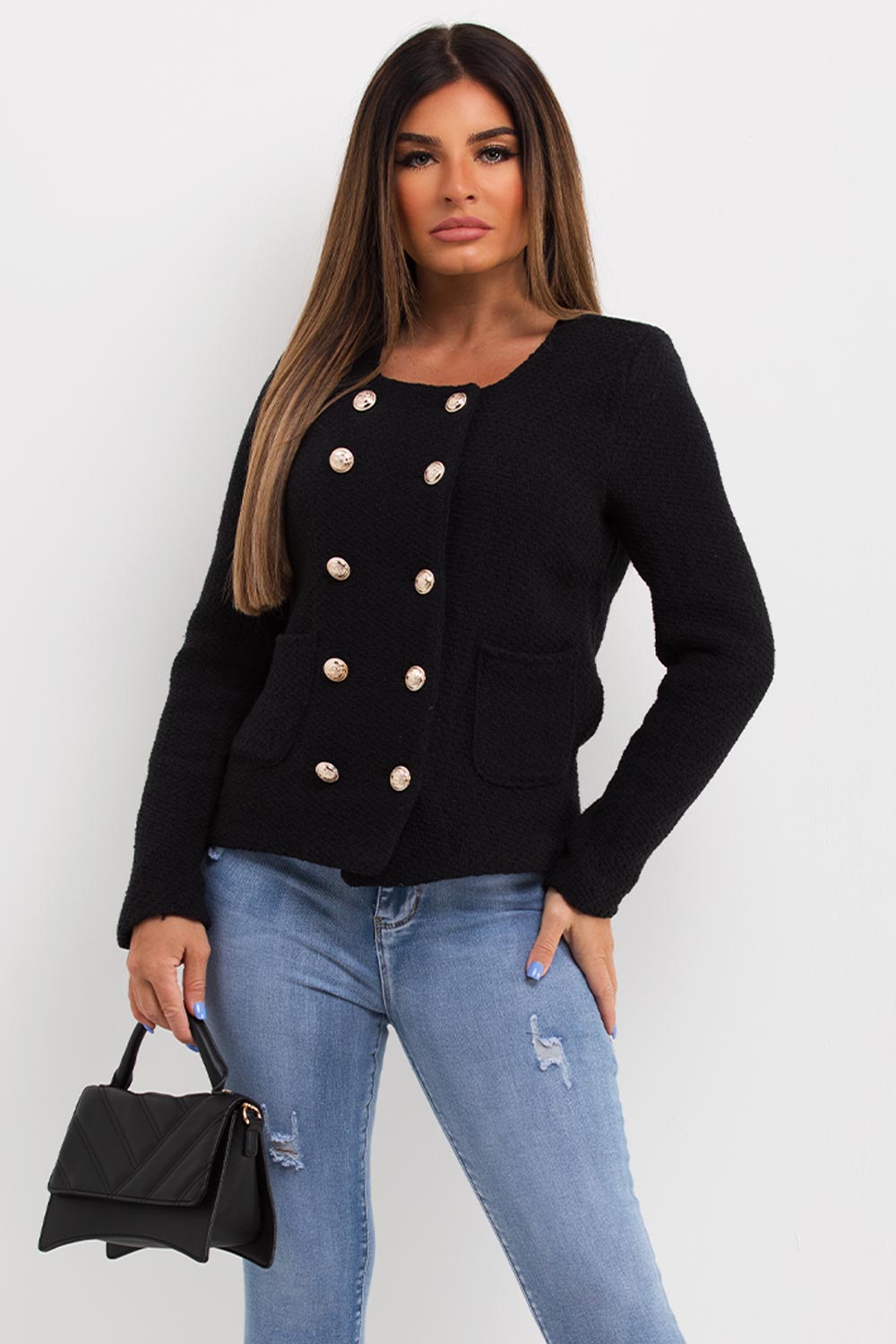 Tweed blazer jacket with gold buttons. Get ready for any occasion with this mock tweed jacket. Featuring mock tweed blazer jacket with gold button fastening. Style it with our nice nice jeans a top to complete the look we are loving. Also available in other colors.