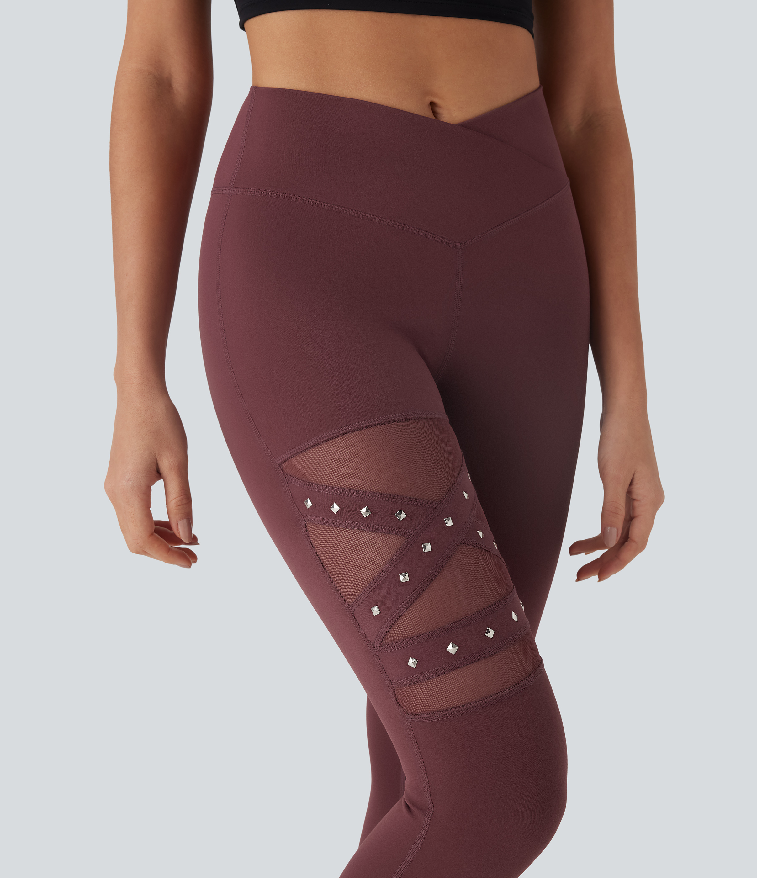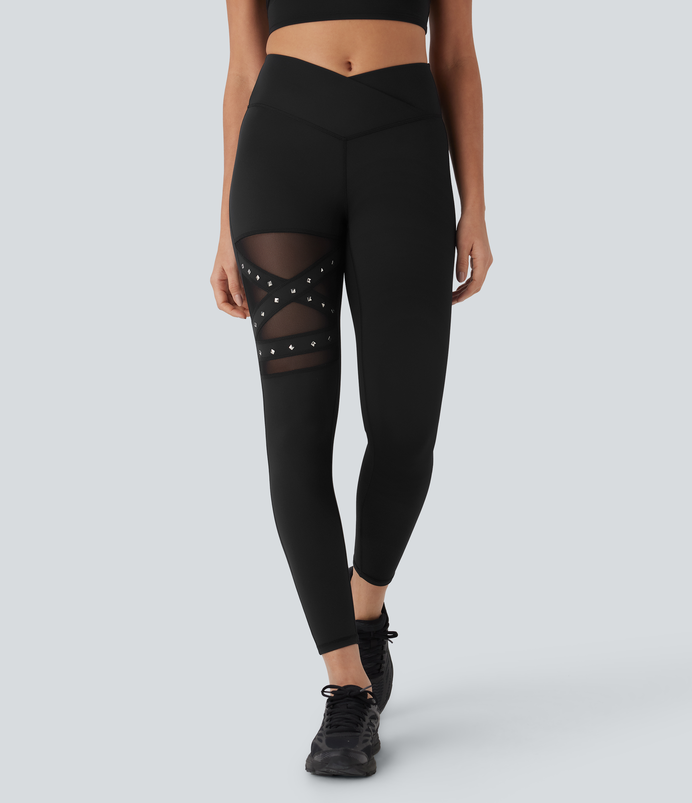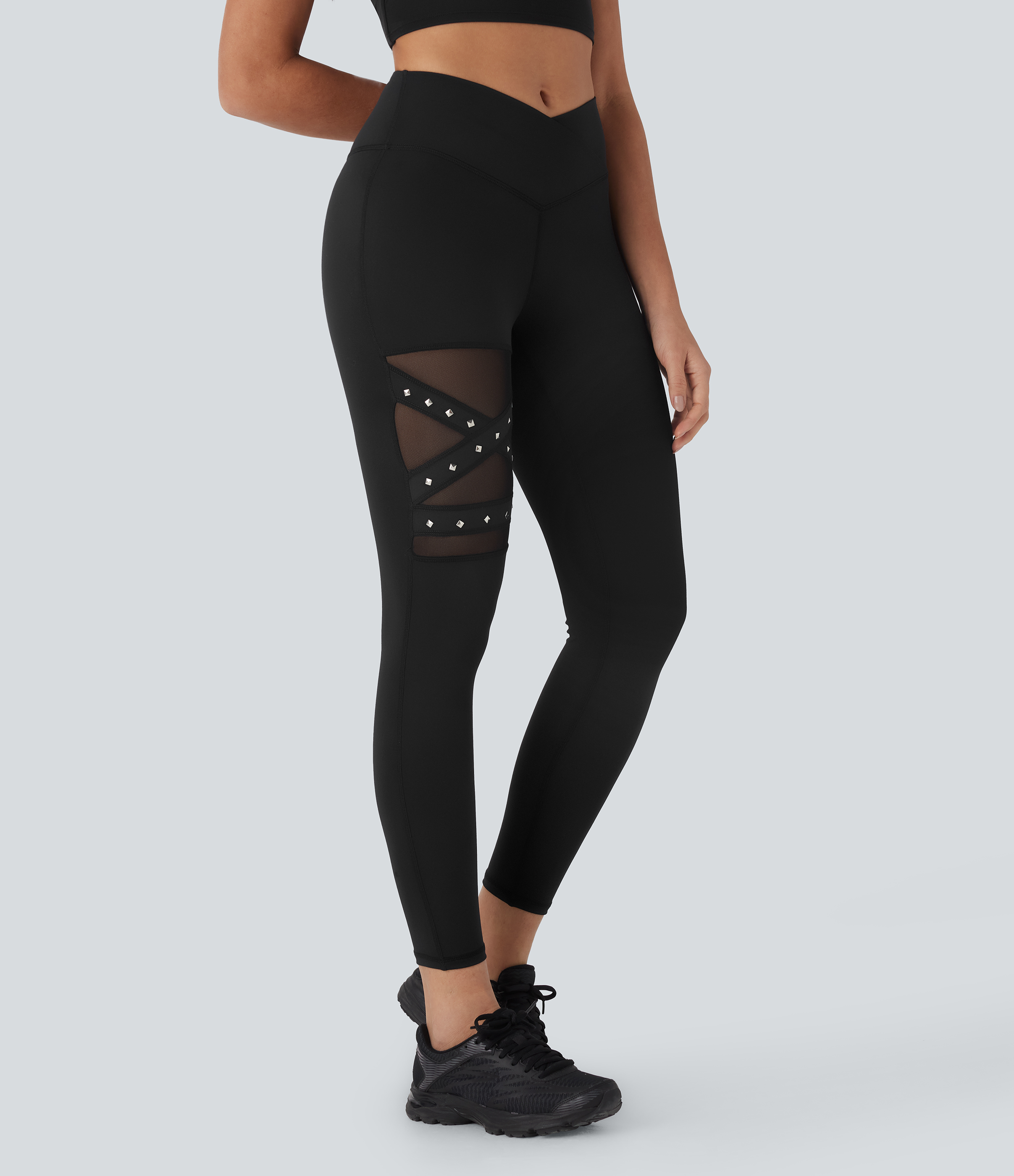 High Waisted Crossover Contrast Mesh Studded Yoga Leggings with Pocket