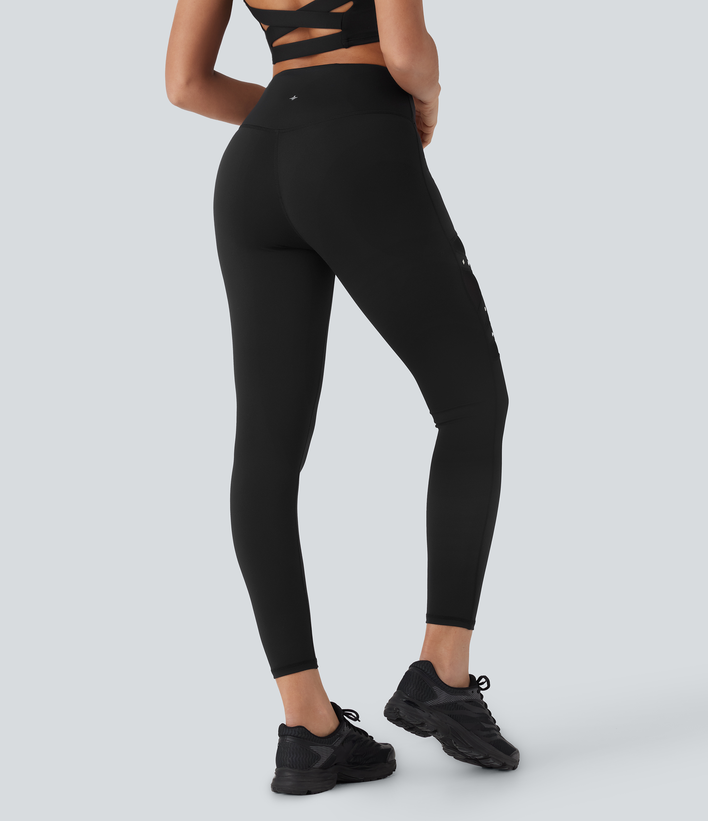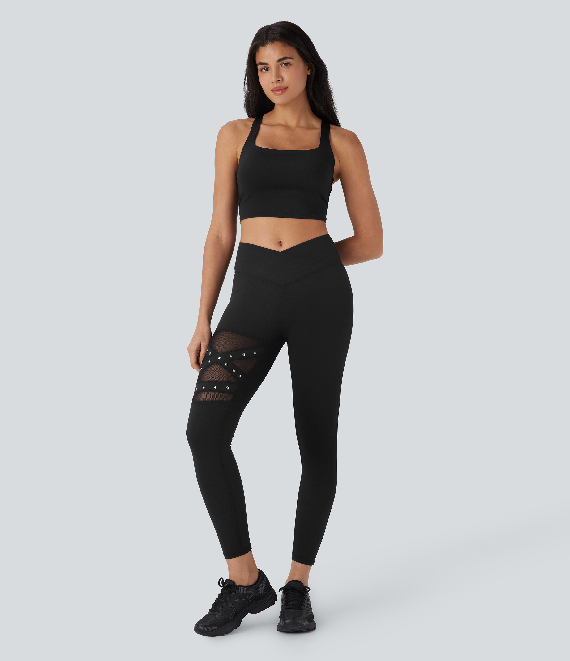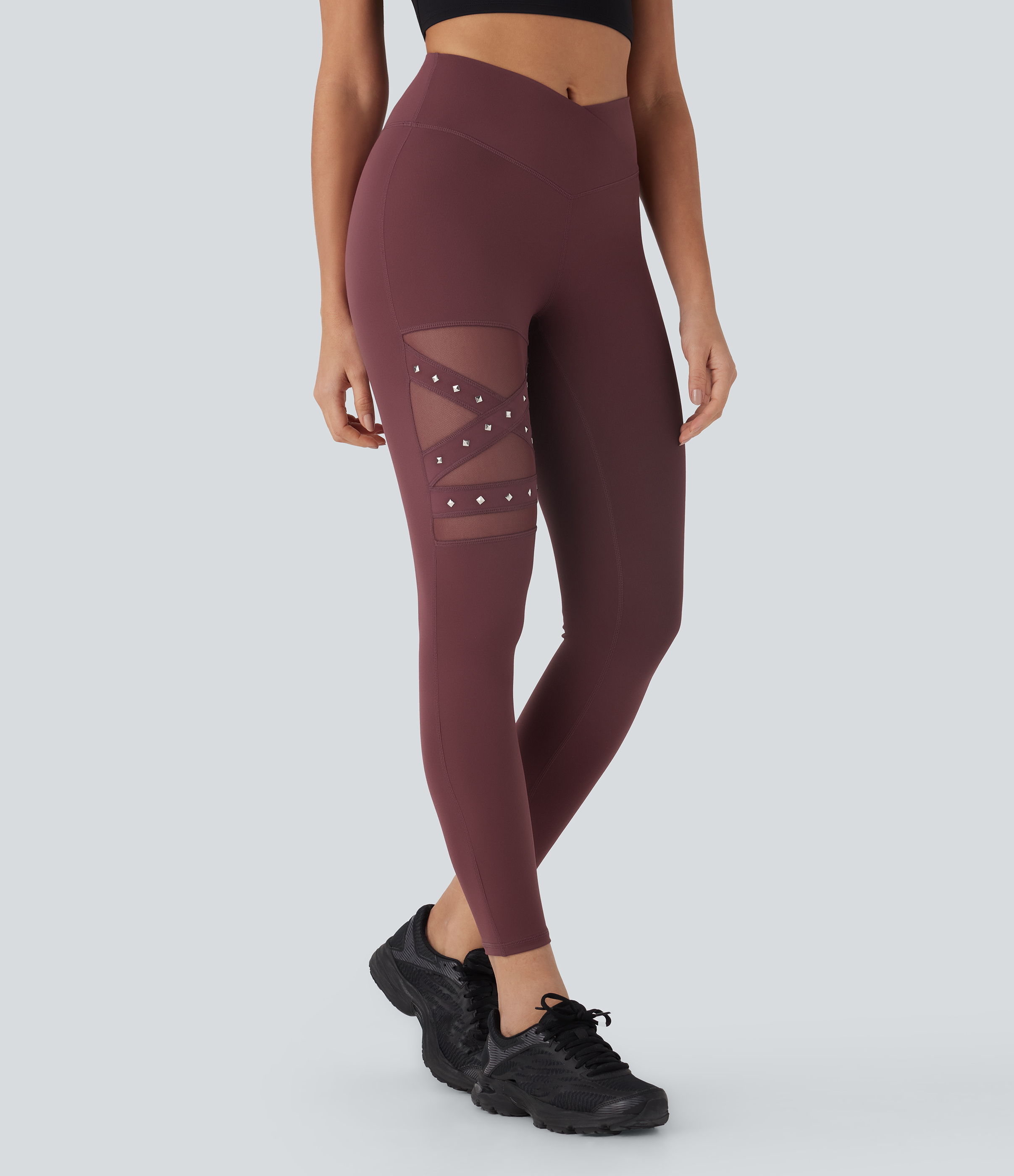 High Waisted Crossover Contrast Mesh Studded Yoga Leggings with Pocket