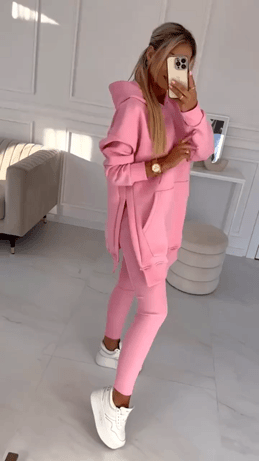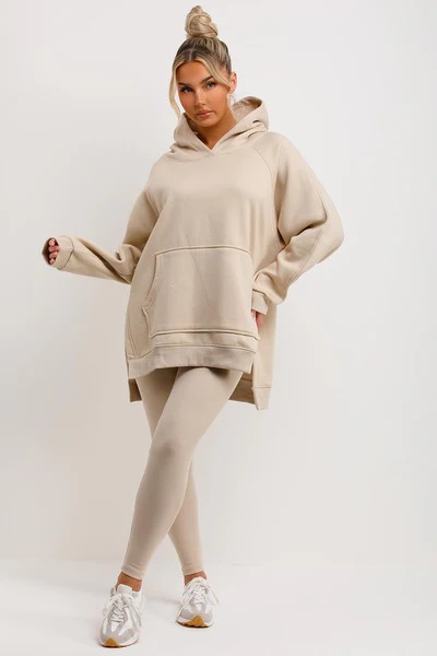 Hoodie and leggings set. This oversized hooded sweatshirt and matching leggings set is the outfit, you must have in your wardrobe. This hoodie and leggings set features oversized hooded sweatshirt with kangaroo pockets side split detail and matching high waist rib leggings. Style this hoodie and leggings two piece set with fresh kicks to complete the look we are loving. This matching hooded sweatshirt and leggings co ord set is also available in other colours.