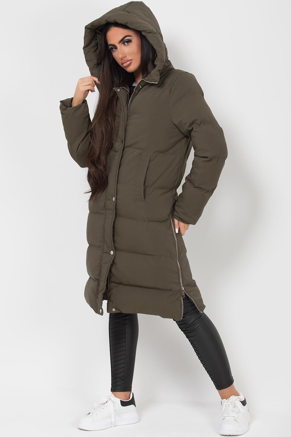 Long puffer coat with side zip. This padded puffer coat is a must have for this new season. This long padded coat features padded puffer style, zip and stud fastening, hooded and side zip detail, weather resistant. Perfect for everyday use. Also available in other colours.