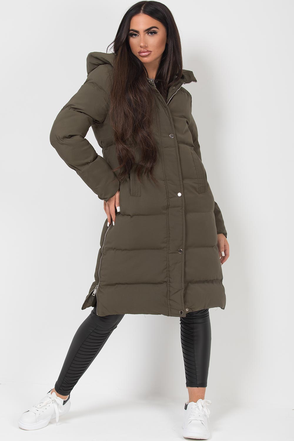 Long puffer coat with side zip. This padded puffer coat is a must have for this new season. This long padded coat features padded puffer style, zip and stud fastening, hooded and side zip detail, weather resistant. Perfect for everyday use. Also available in other colours.