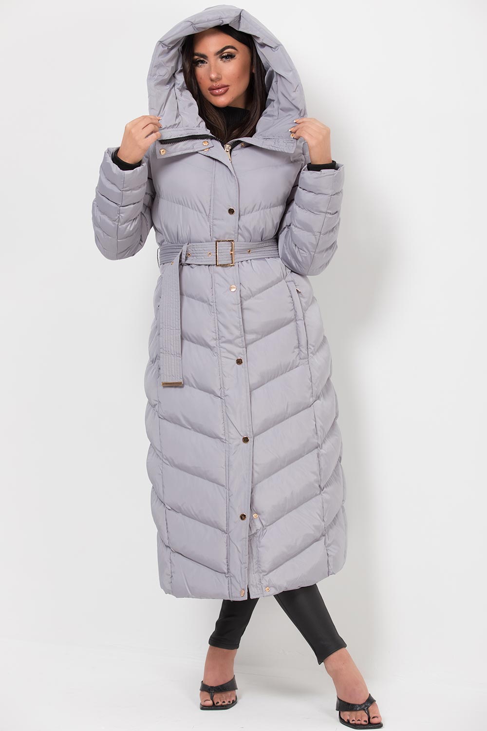 Long puffer coat with belt. This longline coat is a must have for your new season wardrobe. Featuring puffer padded quilted coat, extremely warm, weather resistant, wind proof, hooded, zip and button fastening, pockets, waist belt and god button detail on back. Style it with our high waisted jeans and fresh kicks to complete the look.