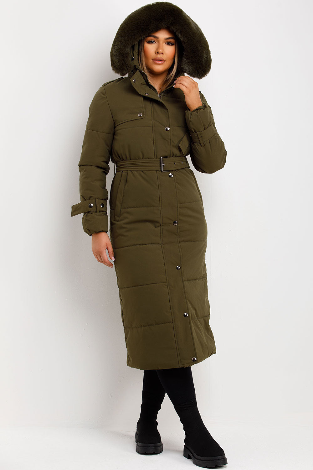 Long Puffer Trench Coat With Belt And Faux Fur Hood Khaki