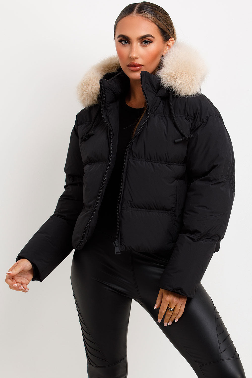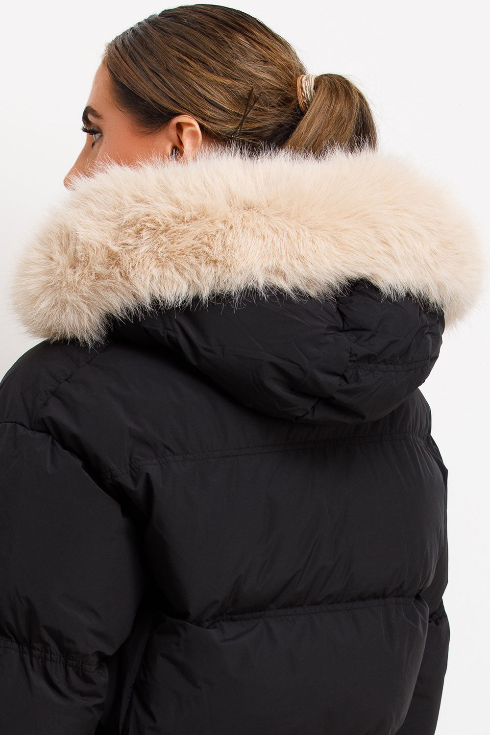 Puffer jacket with fur hood. This fur hood jacket is sure to be perfect addition for your outerwear wardrobe. Featuring faux fur hood puffer jacket with zip fastening pockets drawstring hem extremely warm wind proof padded weather resistant and premium quality. This fur hood puffer jacket is perfect to complete you new season look. This puffer jacket with faux fur hood is also available in other colours.