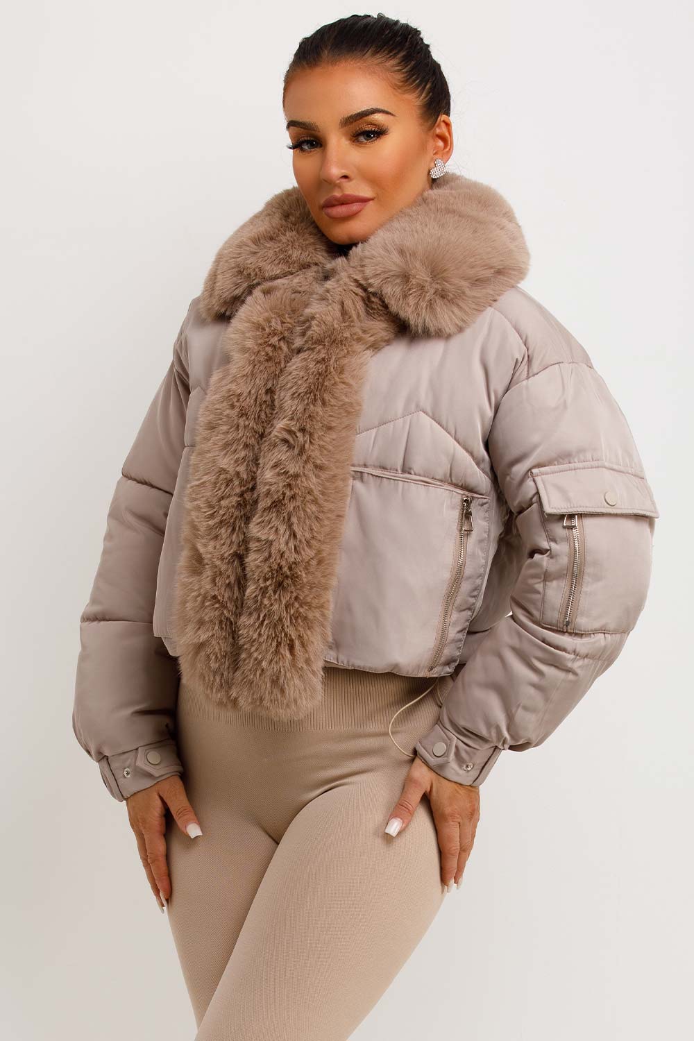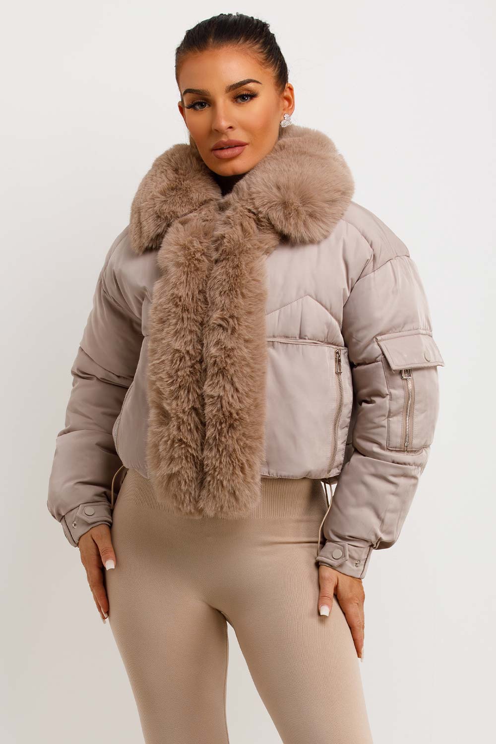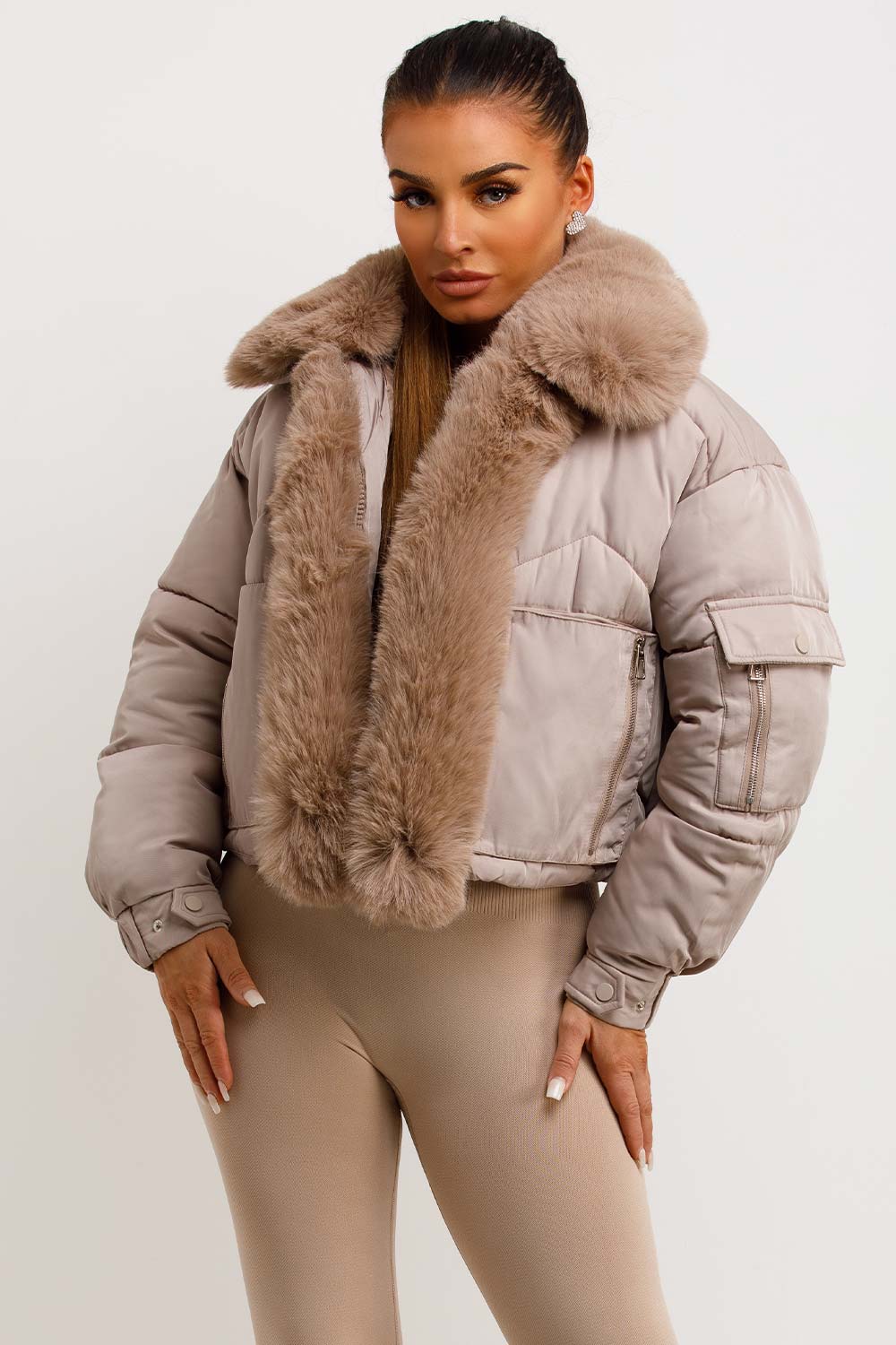 Puffer jacket with fur trim. This puffer jacket is going to replace all your existing outerwear pieces. Featuring premium puffer jacket with faux fur collar and trim zip fastening pockets, elasticated drawstring hem extremely warm weather resistant and windproof. Style this padded puffer jacket with any outfit to complete the look we are loving. This fur trim puffer jacket is also available in other colours.