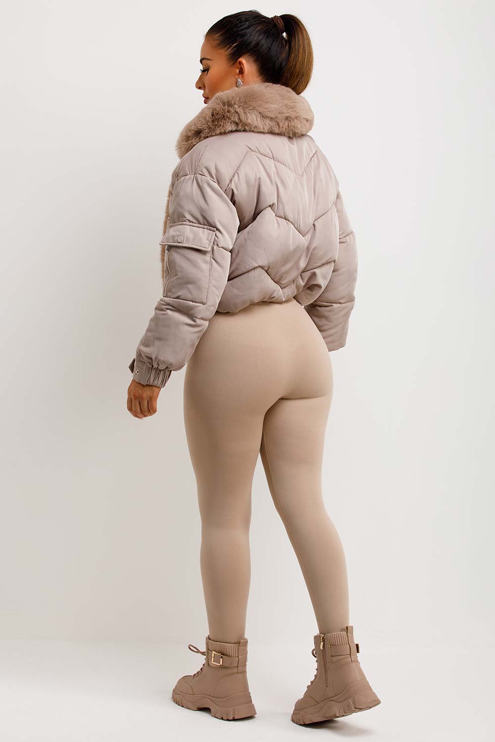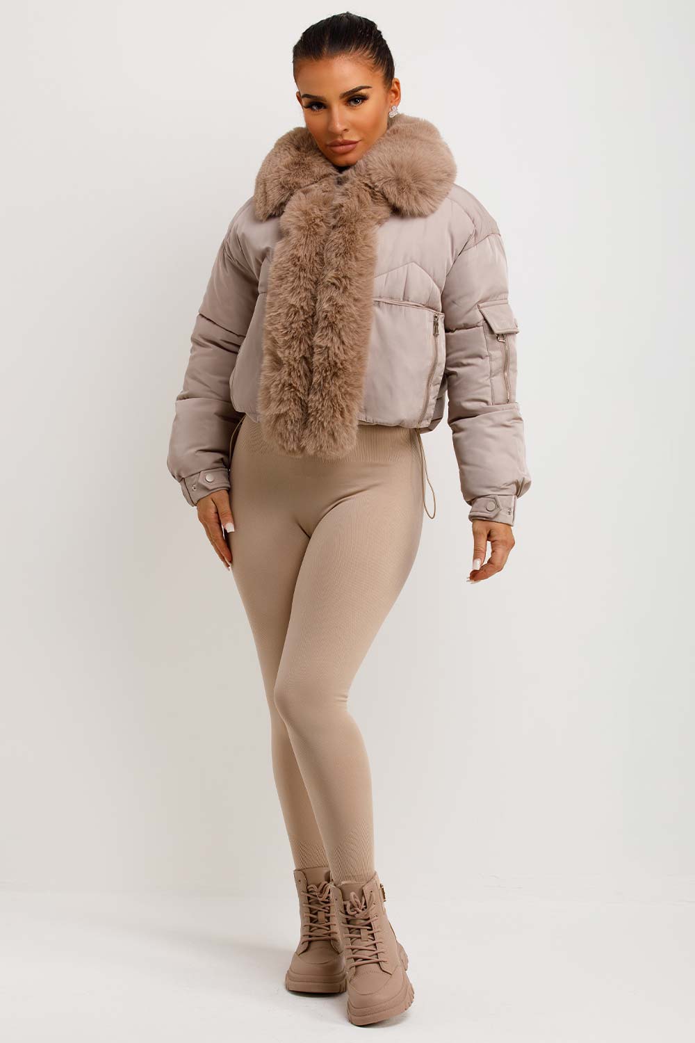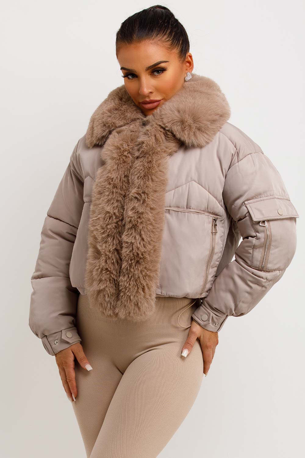 Puffer jacket with fur trim. This puffer jacket is going to replace all your existing outerwear pieces. Featuring premium puffer jacket with faux fur collar and trim zip fastening pockets, elasticated drawstring hem extremely warm weather resistant and windproof. Style this padded puffer jacket with any outfit to complete the look we are loving. This fur trim puffer jacket is also available in other colours.