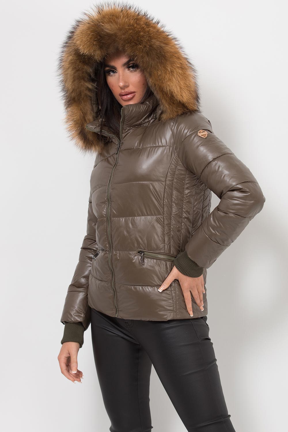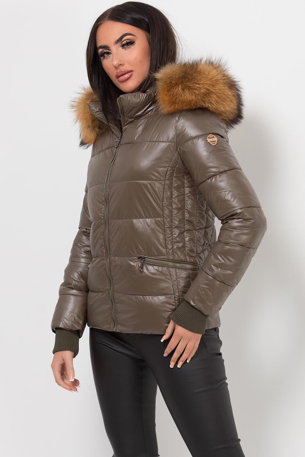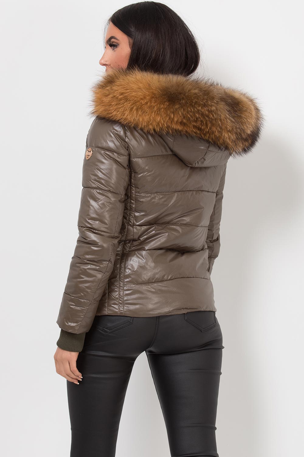 Puffer jacket with real fur hood. This is the padded puffer jacket you need babe. This padded jacket features weather resistant puffer style ethically sourced detachable thick natural fur trim zip pockets and zip fastening. Style it with our high waist leather look leggings. Also available in other colours.