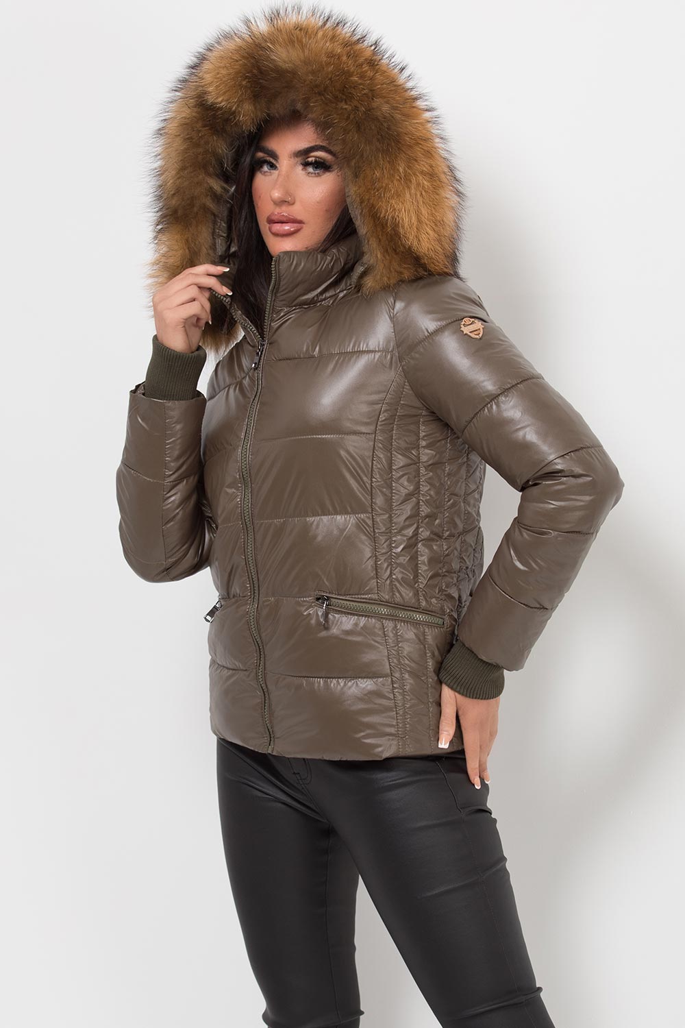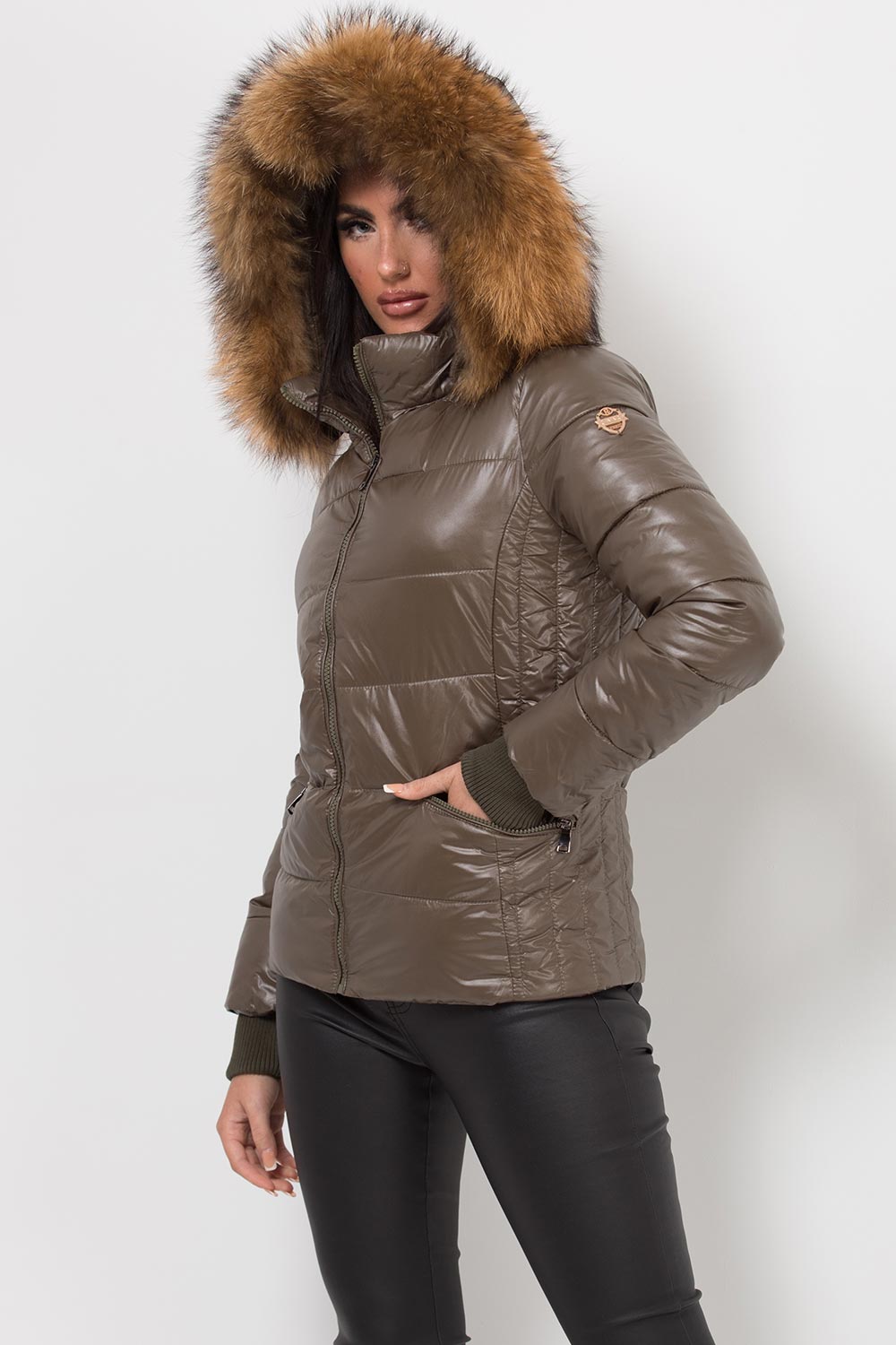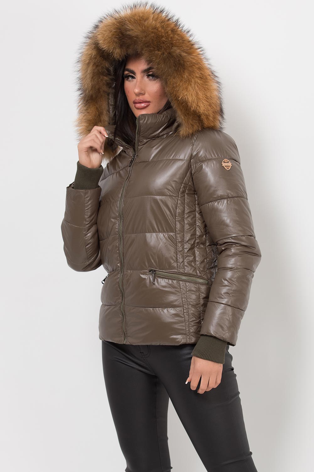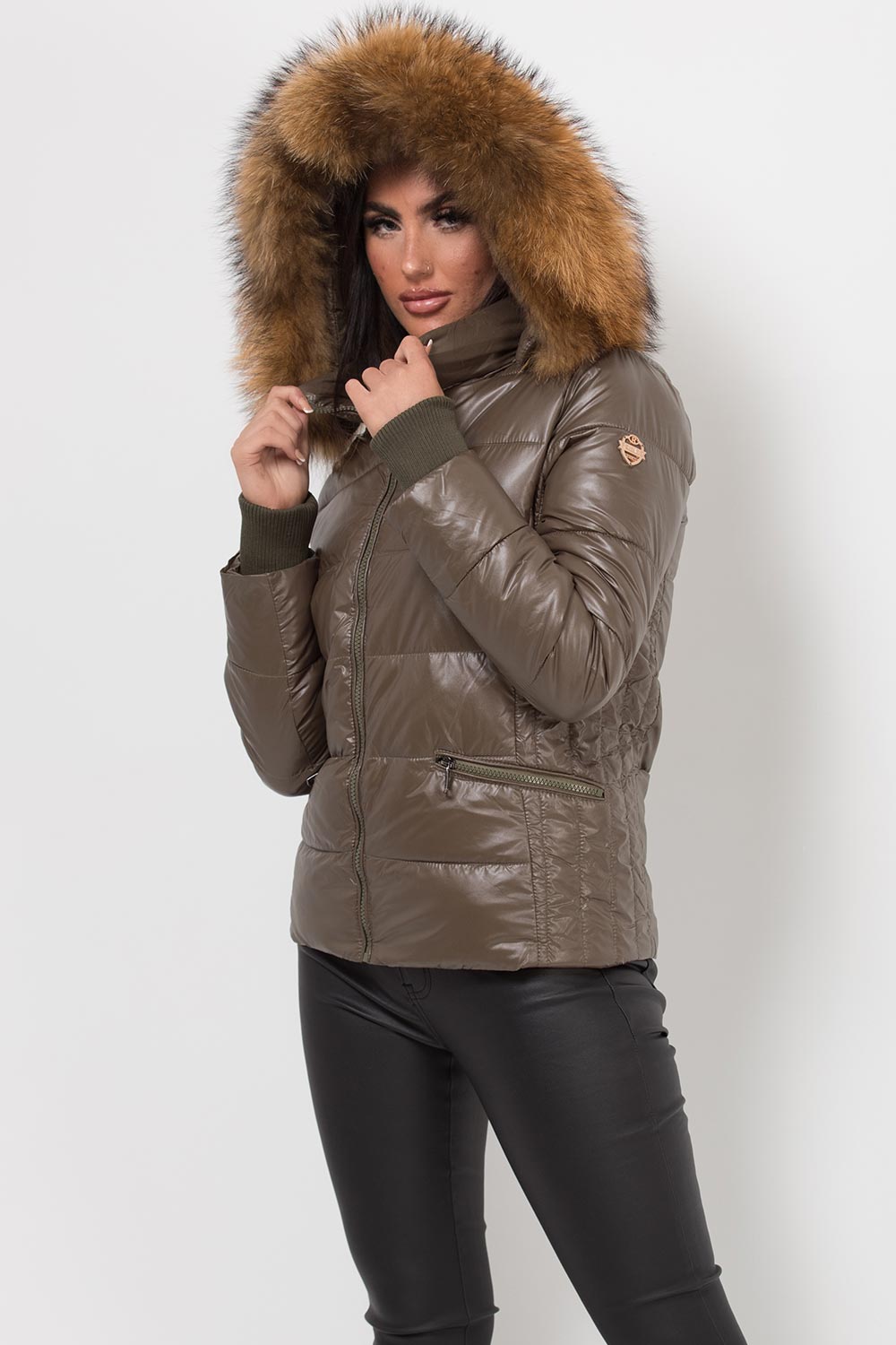 Puffer jacket with real fur hood. This is the padded puffer jacket you need babe. This padded jacket features weather resistant puffer style ethically sourced detachable thick natural fur trim zip pockets and zip fastening. Style it with our high waist leather look leggings. Also available in other colours.