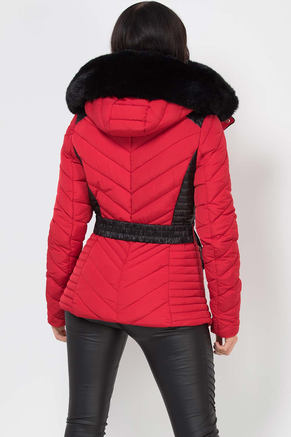 Puffer jacket with faux fur hood and elasticated waist belt. This puffer jacket is a NEED for this new season. Featuring padded puffer jacket, extremely warm with quilted side panel detail, luxury faux fur hood, elasticated waist belt, zip pockets and zip fastening. Also available in other colours.
