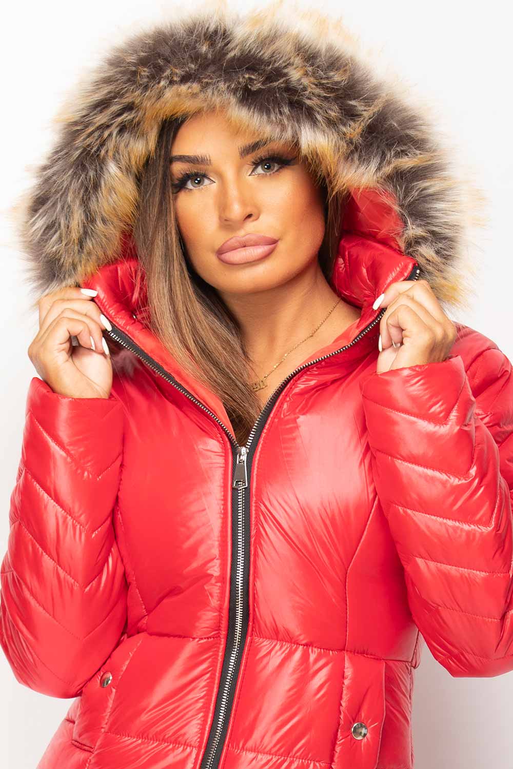Meet your new puffer jacket. Featuring shiny puffer jacket with faux fur hood, quilted detail on arms, side pockets and detachable hood. Style it with our jumper and high waisted jeans to complete the look. Also available in Black.
